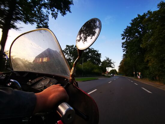 Anreise, zunächst ich mit Navi voraus, den Guzzifahrer mit Beiwagen in den Rückspiegeln im ständigen Visier.