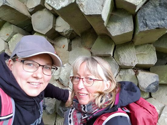 An den Hängen sehen wir unzählige mit Moos überwachsene Steine, sogenannte Basaltmeere. Diese Gegend war lange baumlos. Erst mit der Zeit kamen Moose, Pflanzen und Bäume dazu.