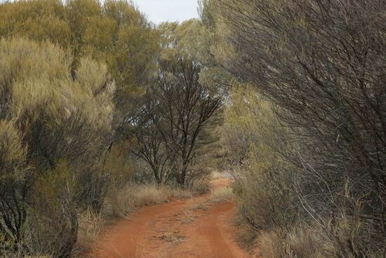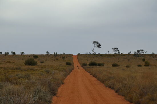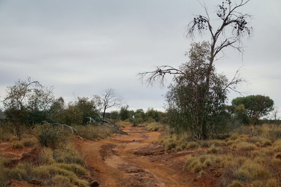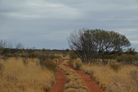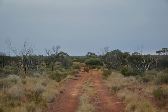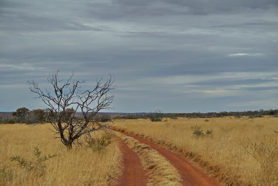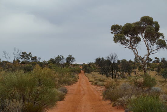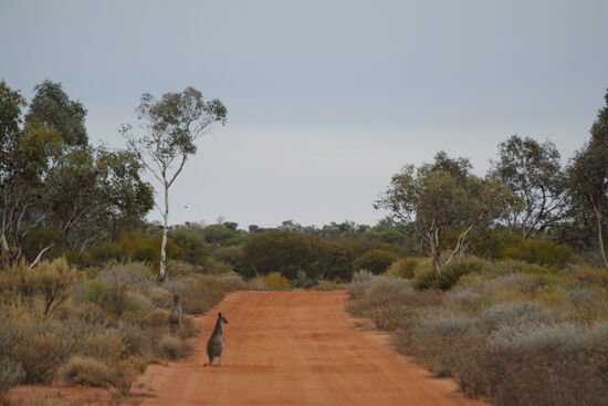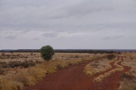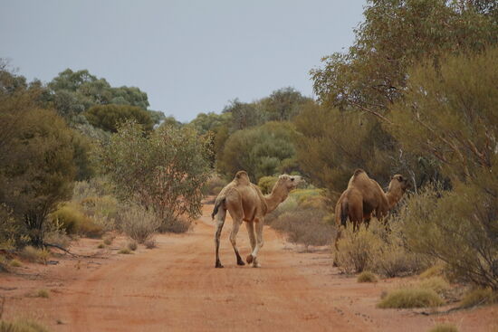 Am nächsten Morgen wollten wir eigentlich um 7:30 Uhr aufstehen, wachen aber um 5:45 auf, es dämmert, aber es tröpfelt auch, im Südwesten hängt eine dunkle Regenwolke. Ungünstig der Regen auf unserem Weg, den wir vor uns haben, wegen Sandpiste und so. Wir entscheiden uns (ohne Frühstück) dem Regen davonzufahren, machen schnell alles abfahrbereit und erst später eine Frühstücks-pause. Insgesamt fahren wir an diesem Tag rund 160 km Rumpelpiste. Am Weg sind wir wieder Kamelen und Kangaroos begegnet.