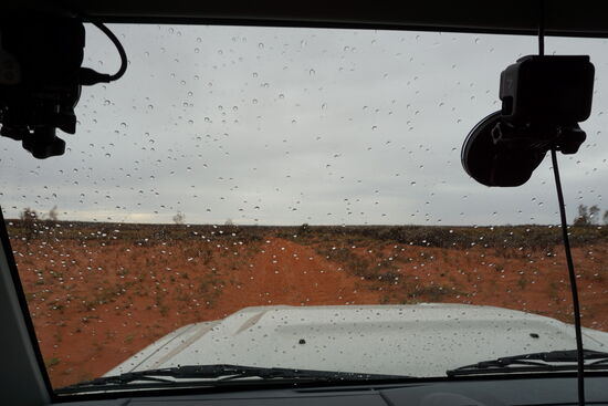 Robert meint aber, dass es doch nicht so viel Regen war, dass wir uns wegen der Pistenverhältnisse sorgen machen müssten und frühstücken erstmal gemütlich. Gegen 10:00 Uhr fahren wir wieder weiter, es regnet den größten Teil der Tagesstrecke weiter so leise vor sich hin und wir hinterlassen frische Autospuren im Sand. Irgendwann bemerken wir, dass vor uns auch zwei frische Autospuren sind.