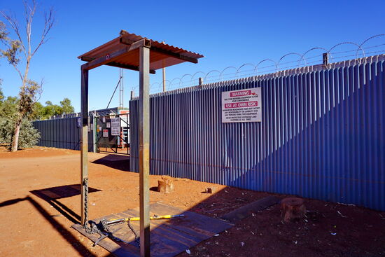 Auf der Suche nach der Police Station in diesem Ort - es hat durchaus einige Häuser - fahren wir scheinbar durch die gefährlichste Straße überhaupt hier. Lauter Aborigines lungern auf der Straße herum und schreien und streiten vermutlich, einige dürften auch betrunken sein. Auch unzählige Hunde laufen da herum. Manche Aborigines deuten uns den Weg, sozusagen weg hier, hier seid ihr falsch. Finden die Polizeistation dann doch und wollen uns abmelden. Als wir eintreten und klingeln, geht eine Tür auf und ein Aborigine-Mann wird aus dem Verhörraum offensichtlich gerade wieder entlassen. Nach unseren Formalitäten wünschen uns die zwei netten Officers noch weitere gute Reise.