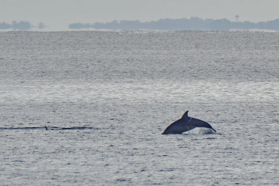 Müssen uns jetzt aber tummeln, da man ja den Campingplatz um 10:00 Uhr verlassen muss und wir vor Abfahrt noch duschen wollen. Am Rückweg zum Campingplatz entdecken wir doch einige Delphine und können nette Aufnahmen machen, leider wieder etwas weit entfernt.
