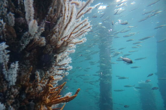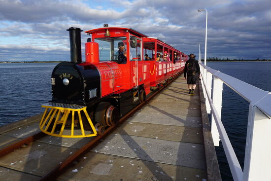 Dort angekommen fahren wir gleich mit dem Zug am Steg - dem Busselton Jetty - entlang, um am Ende des langen Steges aufs Meer hinaus ein Unterwasser Observatorium zu besuchen. Zurück gehen wir zu Fuß - 1,7 km.