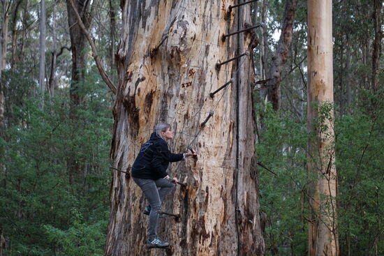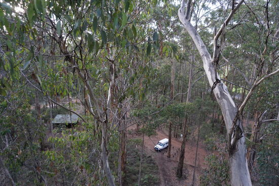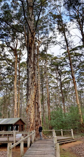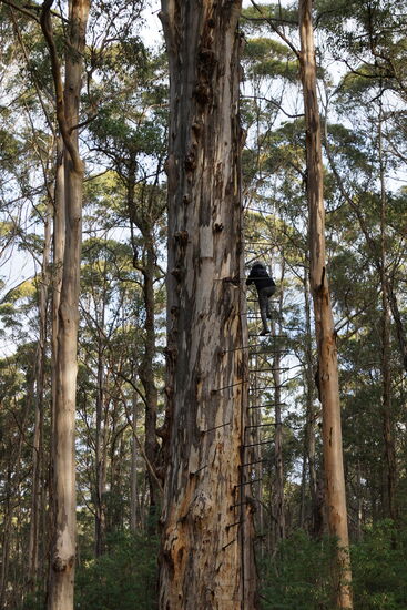 Später haben wir etwas abseits der Straße einen Lookout zu einem sehr hohen (52m) Karri-Baum zum Erklettern entdeckt. Ganz oben mit einer überdachten Aussichtsplattform.