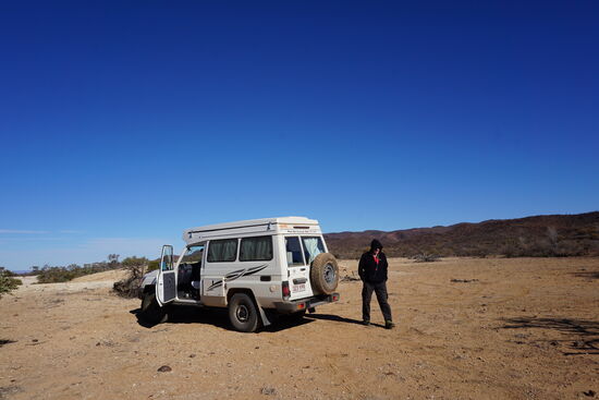 Wir schlafen wieder mutterseelenallein ca. 25 km nördlich von Balcanoona nahe einer aufgelassenen Grube, die vielleicht mal für eine Miner- oder eine Pipeline-Company ausgehoben wurde, etwas abseits der Piste hinter ein paar Büschen versteckt.
