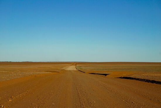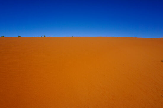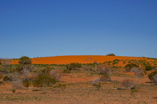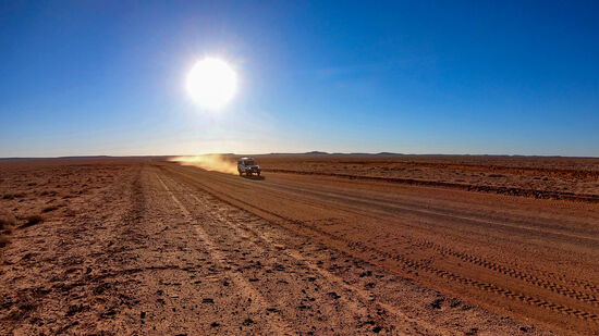 Eigentlich wollen wir weiter nach Osten, aber Robert möchte unbedingt zuerst noch ein paar Kilometer nordöstlich fahren, weil 2013 dort so eine schöne tiefrote Sandpiste war. Jetzt wissen wir, warum sie damals so tiefrot war, es hatte 2013 zuvor geregnet, da schaut der feuchte Sand gleich viel dunkler aus. Diesmal ist aber alles trocken, auch die Piste an sich dürfte breiter sein als damals.