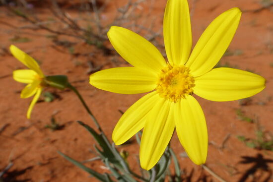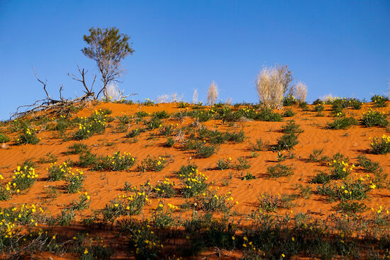 Unser Weg führt uns heute noch 120 km weiter bis Tibooburra. Es gibt entlang des Weges wieder die faszinierenden Sanddünen und die strahlend gelben Blumen.