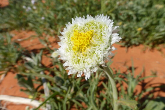 Eine besonders schöne rote Sanddüne muss ausgiebig fotografiert werden und auch die schönen gelben Blumen müssen auf Fotos mit.