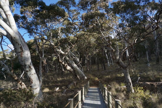 Da wir neugierig sind, ob am oberen Campground doch jemand verblieben ist, schauen wir hin, um wieder, wie gestern, die Kangaroos zu beobachten. Keine Kangaroos heute dort, kalt und seeehr windig, da heute aber Samstag ist, kommen doch einige wenige Autos auf den Berg hinauf, wir schätzen so ca. zehn im Lauf des Vormittags. Außerdem hat sich das gestrige Rätsel für uns jetzt auch gelöst, da wir sehen, dass bei den Cabins Autos geparkt sind, dürfte diese doch gestern Abend noch jemand für die Gäste hergerichtet haben, also umsonst fast zu Tode gefürchtet.