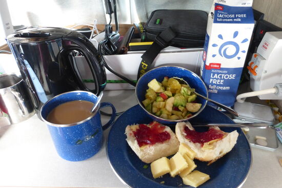 Wir gehen den Tag gemütlich an, um 9:00 Uhr ist es im Auto endlich wieder wärmer und wir gönnen uns ein ausgiebiges Frühstück.
