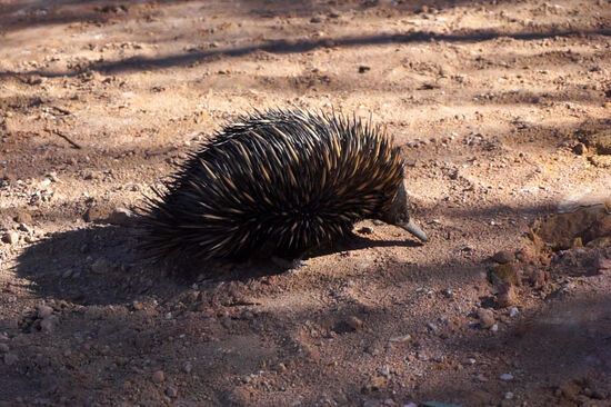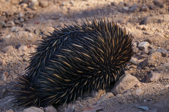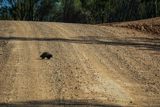 Während wir so dahinfahren, sehen wir in einer Steigung vor uns etwas kleines dunkles über den Weg laufen. Wir fahren links ran und schauen nach was das ist. Zu unserer Freude ist es ein Echidna (Schnabeligel).