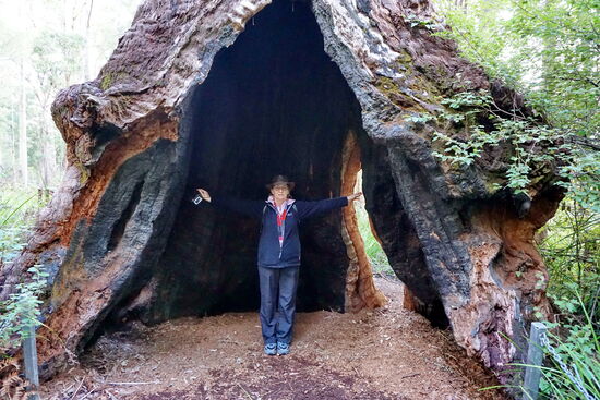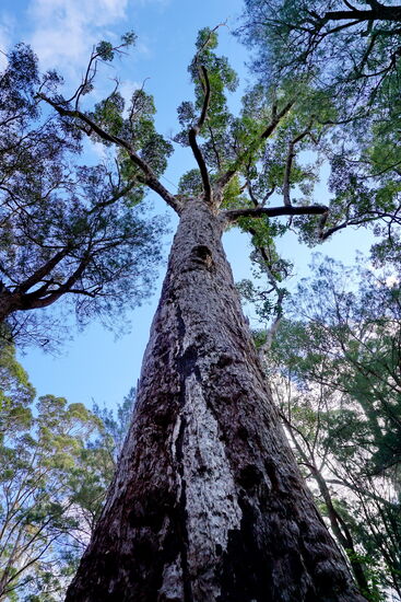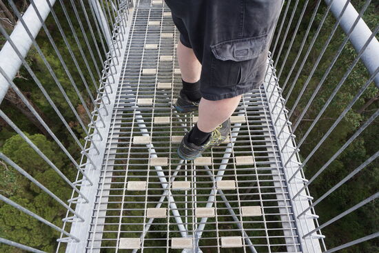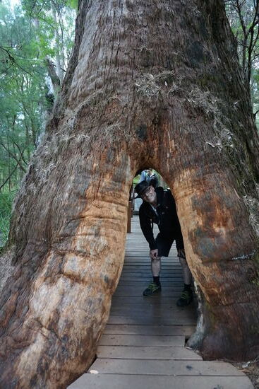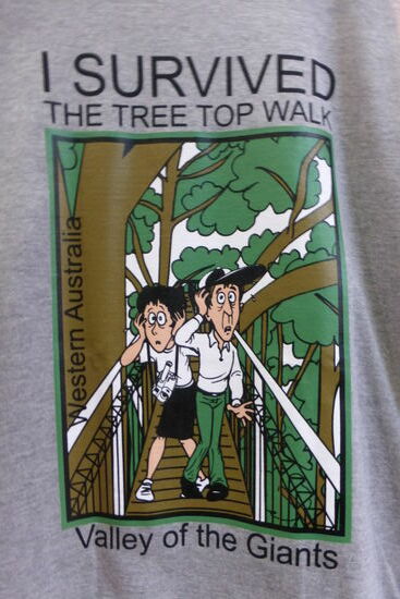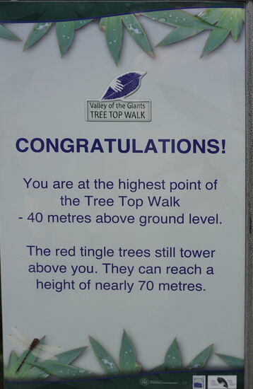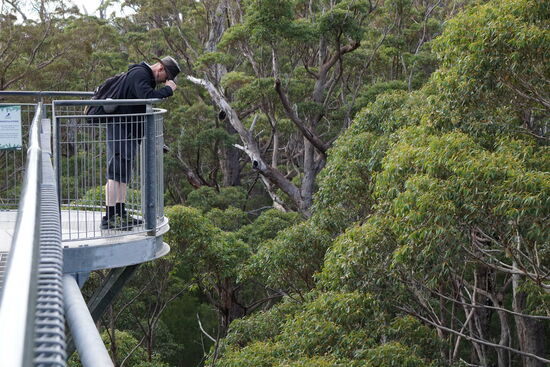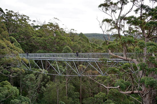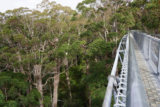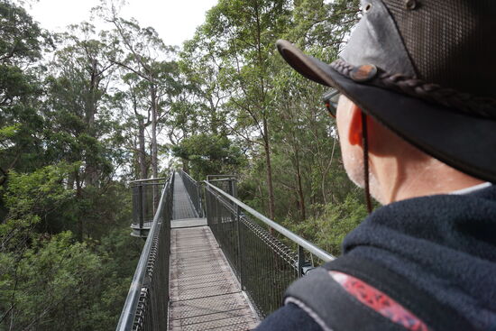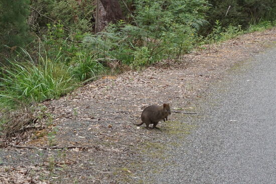 Ganz in der Nähe ist der Tree Top Walk, wo man auf bis zu 40 m Höhe auf Hängebrücken zwischen den Baumkronen der alten Baumriesen wandern kann. Auf der Zufahrtstrasse läuft uns ein Quokka (Mini-Kangaroo) über den Weg.
