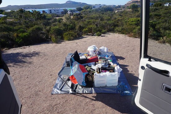Ein Cracker war zur Hälfte aufgegessen und die, in verschließbare Plastiksackerl umgefüllten Nüsse, Cranberries und Studentenfutter, die in einer Lade gelagert waren, waren allesamt durchgebissen. Überall sind auch "Mauspemmerl" herumgelegen, die hat ordentlich gefuttert die ganze Nacht. Da war natürlich erstmal Großreinigung angesagt, um die Maus aus dem Auto wieder loszuwerden, wir wussten ja nicht, wo sie war. Also alles auf eine Plane, die wir zu Beginn der Reise besorgt hatten, weil sowas kann man ja immer brauchen, rausräumen, alles kontrollieren, putzen, Lärm machen, um die Maus möglichst zu vertreiben und alles wieder einräumen.