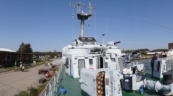 An der Nordseite liegt seit 2017 ein NVA-Schiff, das Schnellboot "Hans Beimer" als Museumsschiff zu besichtigen, 6€ Eintritt. Von 1986-1990 war das Raketenschiff in der Ostsee im Einsatz, noch gar nicht so lange her. Das konnten wir uns in aller Ruhe anschauen, auch die Durchgänge waren für uns ohne Probleme zu passieren.