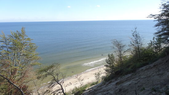 Weiter bis zum Parkplatz am "Forsthaus Langenberg", 54m hoch gelegen, direkt an der Steilküste. Tagesticket für 5€ an der Rezeption erhältlich. Da uns klar war, bis nach unten auf Meeresniveau über eine steile Treppe, schaffen wir eh nicht, durften wir 1 Stündchen kostenlos auf dem Parkplatz stehenbleiben. An der Abbruchkante entlang verläuft ein Weg, von dem man herrliche Aussichten auf das Meer hat.
