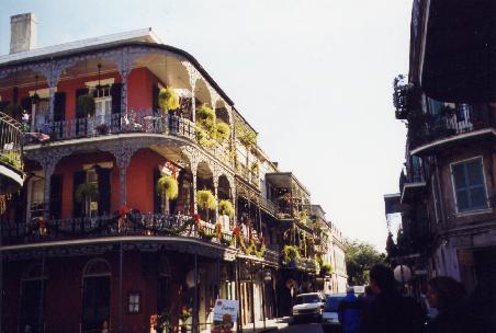Wir schlendern durch die Bourbon Street und schauen uns die schönen Häuser mit den tollen Balkonen an.
