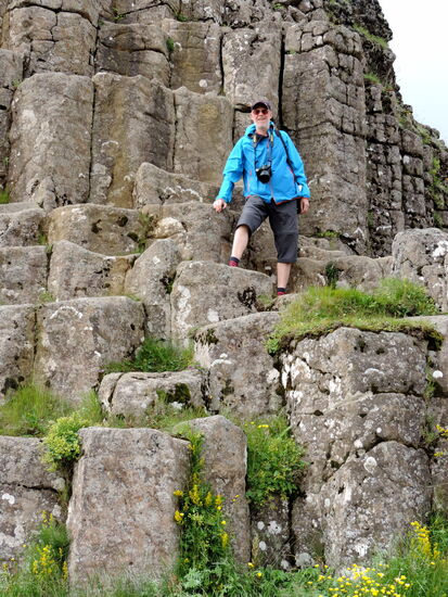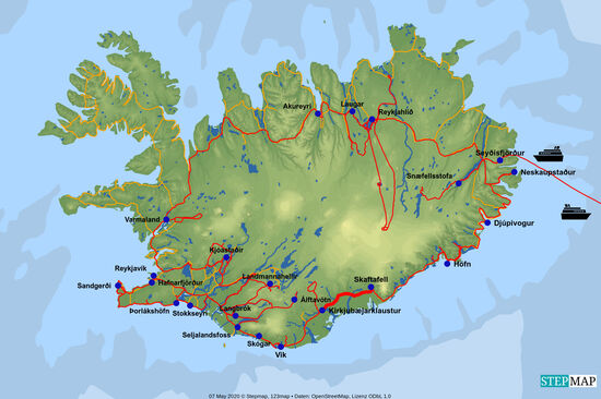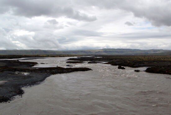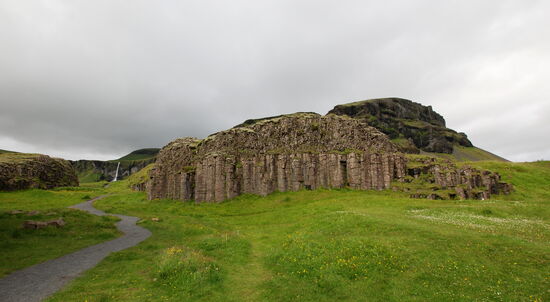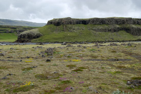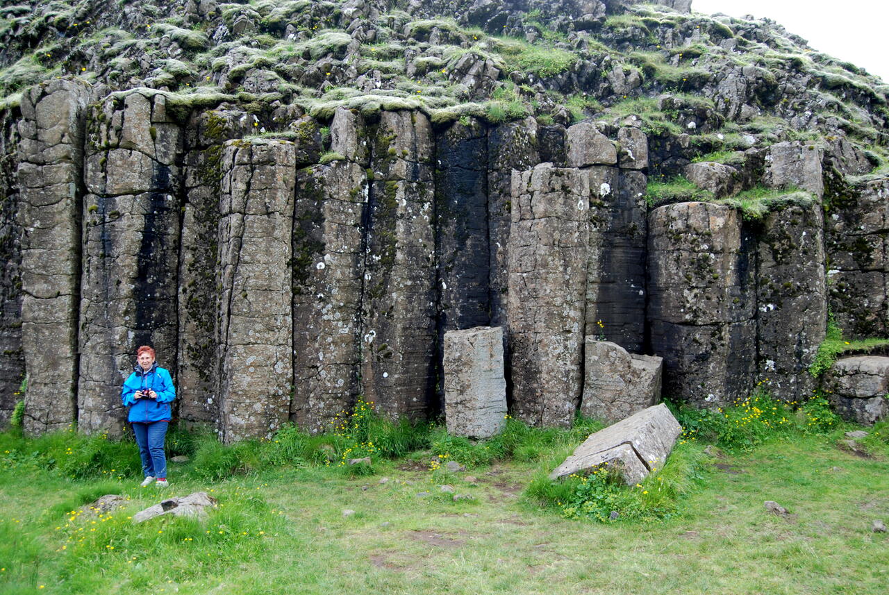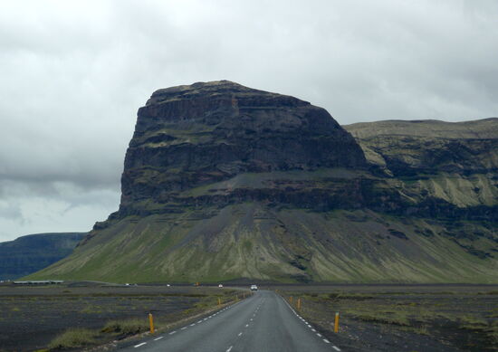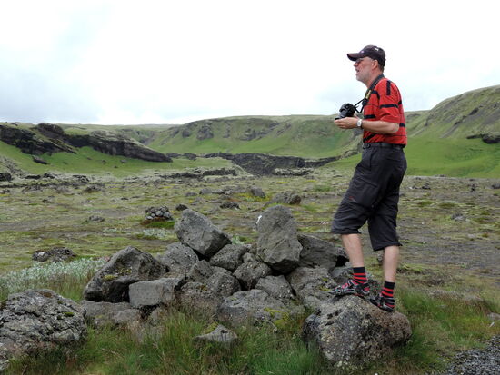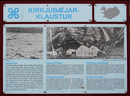 Weiter ging die Fahrt über den Sander. Kurz danach war die Straße auf einen Damm verlegt worden, und eine kleine zweispurige Brücke umging dort die lange einspurige Brücke, die wir links neben uns sahen. Von einem Parkplatz hatten wir einen schönen Blick auf den flachen Gletscher Skeiðarárjökull. Die Landschaft war flach und teilweise von Flußläufen durchzogen. Dämme sollen die Gletscherläufe kontrolliert ableiten. Wir fuhren auf den Felsen Lómagnúpur zu. Das war einmal das höchste Meereskliff der Welt, bevor sich die Sander bildeten. Nun führte die Straße an den Bergen entlang. Rechts sahen wir Häuser. Es war der alte Hof Núpsstaður. Leider gab es keinen richtigen Parkplatz, und der Weg war als privat ausgeschildert. Wir konnten gerade eben mit dem Gespann neben der Straße halten. Von weitem sahen wir die alten Torfhäuser und auch die kleinste erhaltene Torfkirche. Weiter ging die Fahrt über einige Flußläufe mit Aussichten in die Täler. Beim Tuff-Felsen Orrustuhóll, der wie eine Mongolenjurte aussah, stieg die Straße an, und bald darauf erreichten wir Dverghamrar. Hier machten wir Rast und strolchten anschließend um die Basaltsäulen. Dies hatte uns schon 2010 gefallen. Nun hatten wir bald Kirkjubæjarklaustur erreicht. Wir stellten den Wohnwagen auf den Campingplatz und fuhren dann zur Information. Die Mitarbeiterin sprach norwegisch und gab uns viele Tips für unsere morgige Fahrt zur Laki-Spalte. Wir konnten sogar auf deutsch einen Film über die Laki-Ausbrüche sehen. Nach einem Einkauf ging es zurück auf den Campingplatz, wo wir unsere Fahrt ins Hochland vorbereiteten.