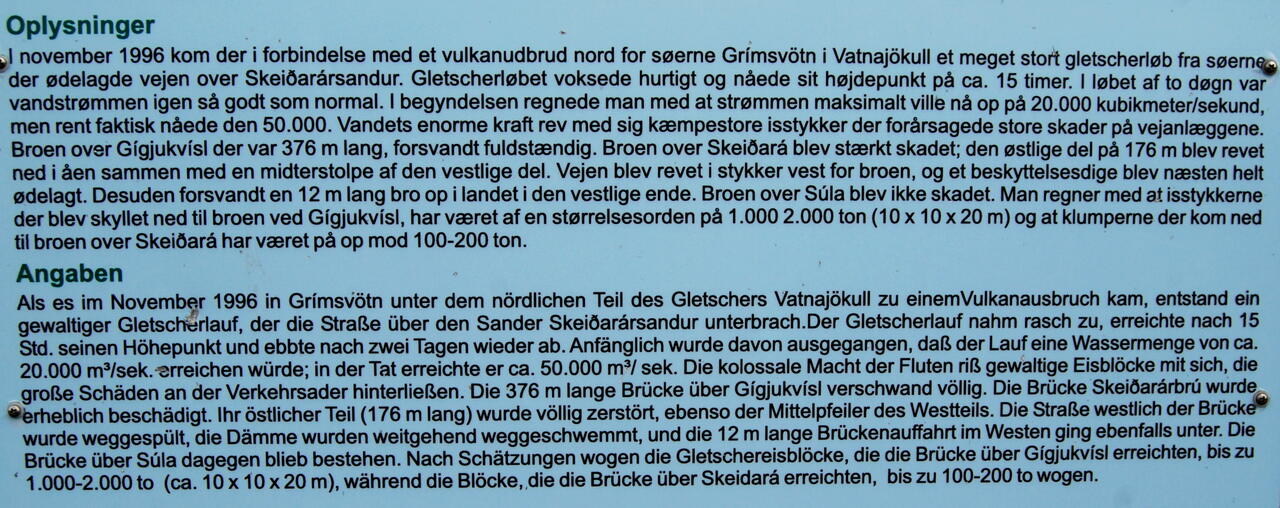 Heute fuhren wir über die riesigen Sanderflächen. Gleich nachdem wir die N1 erreicht hatten, hielten wir noch einmal auf einem Parkplatz. Als Denkmal waren Reste der alten Brücke aufgestellt. 1996 gab es hier einen riesenhaften Gletscherlauf, als die Grímsvötn ausbrach. Dabei wurden viele Brücken zerstört oder stark beschädigt.