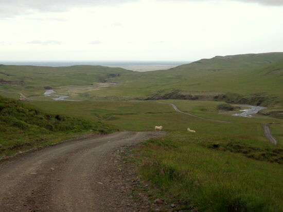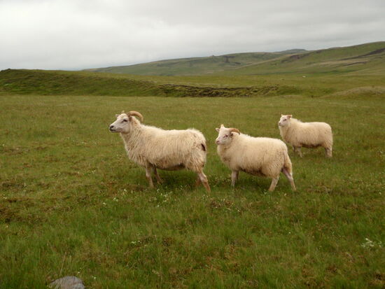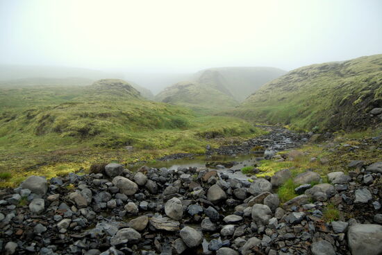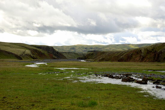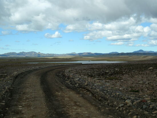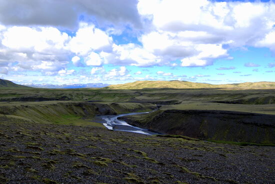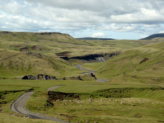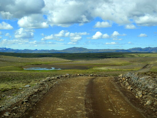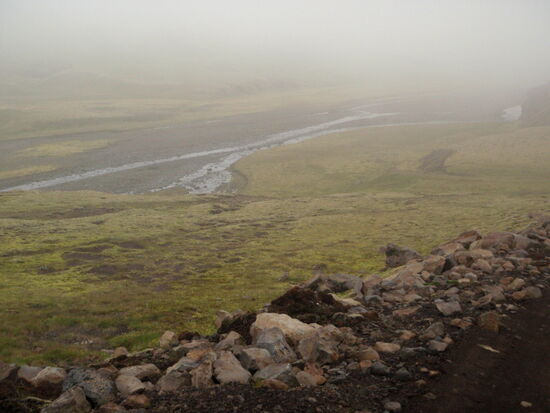 Danach machten wir eine kleine Wanderung durch einen Krater. Unbeschreiblich beeindruckend war das! Weiter fuhren wir durch die Lavafelder. Ein kleiner Abstecher auf einen Berg bescherte uns dann noch einen tollen Ausblick auf die unendlich lange Kette der Vulkanschlote. Weiter ging der geschlängelte Weg zum Tjarnargígur. Ein Bohlenweg führte zum See. Dann hätten wir noch einen Rundweg um einen Krater machen können. Wir fuhren aber weiter. Teilweise ging die Piste über eine flache Hochebene, wo zeitweise Wasser lief. Von einem Bergrücken hatten wir einen weiten Blick auf die Skaftá. In diesem Fluß fand später ein Gletscherlauf statt. Nicht viel weiter kamen wir in ein hübsches grünes Tal mit einem Fluß, den wir durchqueren mußten. Danach ging es wieder durch die Lava, bizarr und schön, ein nicht enden wollender Weg. Um 19h bogen wir dann wieder auf unsere alte Strecke ab. Der Himmel hatte sich immer mehr zugezogen, und auf einmal waren wir mitten in den Wolkenschwaden. Wenig später war der Fahrweg naß mit einigen Pfützen. Hier hatte sich also die dicke schwarze Wolke abgeregnet, welche wir auf der Hinfahrt gesehen hatten. Da wir ja alle Furten kannten, konnten wir zügig in Richtung Campingplats fahren. Auf den Schafsweiden standen jetzt viele Tiere und grasten. Sie beäugten uns kritisch, immer bereit, das Weite zu suchen. Kurz nach 21h waren wir wieder am Wohnwagen und tranken zum Ausklang dieses wunderschönen Tages eine Flasche Wein.