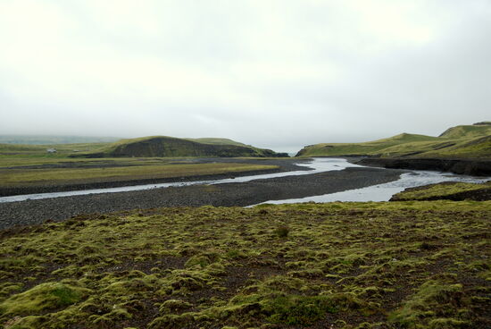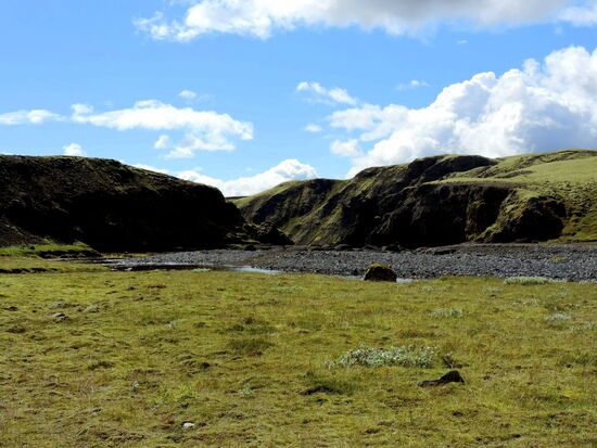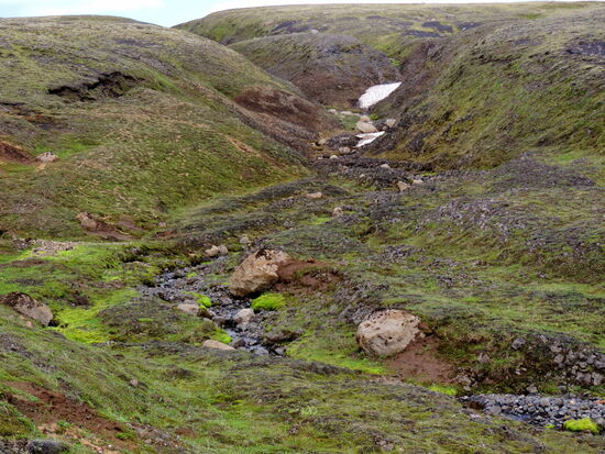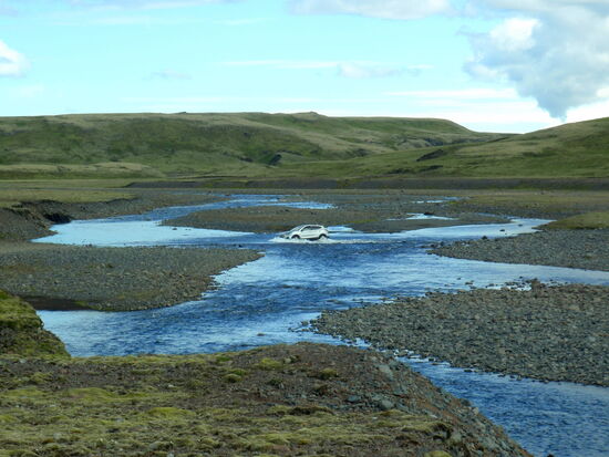 Es war ein herrlicher Sonnentag. Die Einfahrt zur F 206 war schnell erreicht. Hier stand ein großes isländisches Auto, und der Fahrer, ein Ranger, hielt uns an. Er paßte auf, daß auch wirklich nur richtige Geländefahrzeuge hier passierten. Die Piste schlängelte sich durch saftig grünes Schafsweideland. Viele Flächen waren gemäht, und das Heu konnte bei diesem Wetter gut trocknen. Es ging schnell bergauf mit schönen Ausblicken, und es wurde immer hügeliger. In der Ferne konnten wir nun leuchtend weiß den Vatnajökull sehen. Ein paarmal ging es durch kleine Furten. Dann kam die erste größere Flußdurchquerung. Stäbe waren im Bogen so im Fluß aufgestellt worden, wie man fahren sollte. Gelbe Fähnchen an ihnen zeigten an, daß die Wassertiefe um die 30 cm war. Das war kein Problem, unser Pajero hat eine Wattiefe von 60 cm. Der Fluß war ziemlich reißend, und das grobe Geröll im Flußbett machte das Fahren auch nicht leicht. Rainer hatte aber keine Schwierigkeit damit. Gleich danach kam ein Parkplatz. Ein kurzer Weg führte zum Fagrifoss. Welche Überraschung, so einen schönen Wasserfall hatten wir beide nicht erwartet. Der weitere Weg war dann recht holprig und ging ständig bergauf. Dann kamen wieder zwei kleine, einfache Furten und eine lange über eine breite Kiesbank. Die Landschaft war so abwechslungsreich, daß wir ständig anhielten, um zu fotografieren. Waren es gerade noch grüne Wiesen, so wechselten sie nun zu Moosen über, bis auch diese spärlicher wurden und die Flächen aus kleineren Steinen bestanden. Trotzdem blühte es aber überall, hauptsächlich Grasnelken, blasiges Leimkraut und dicke Polster vom kurzstieligem Leimkraut. In der Ferne tauchten nun farbige Berge auf, von creme über grün bis pechschwarz. Das konnten eigentlich nur die Vulkankegel sein.