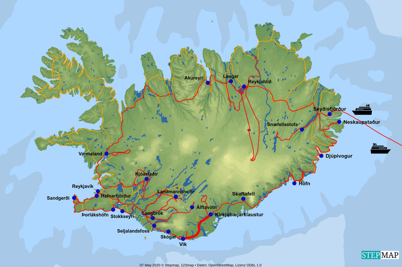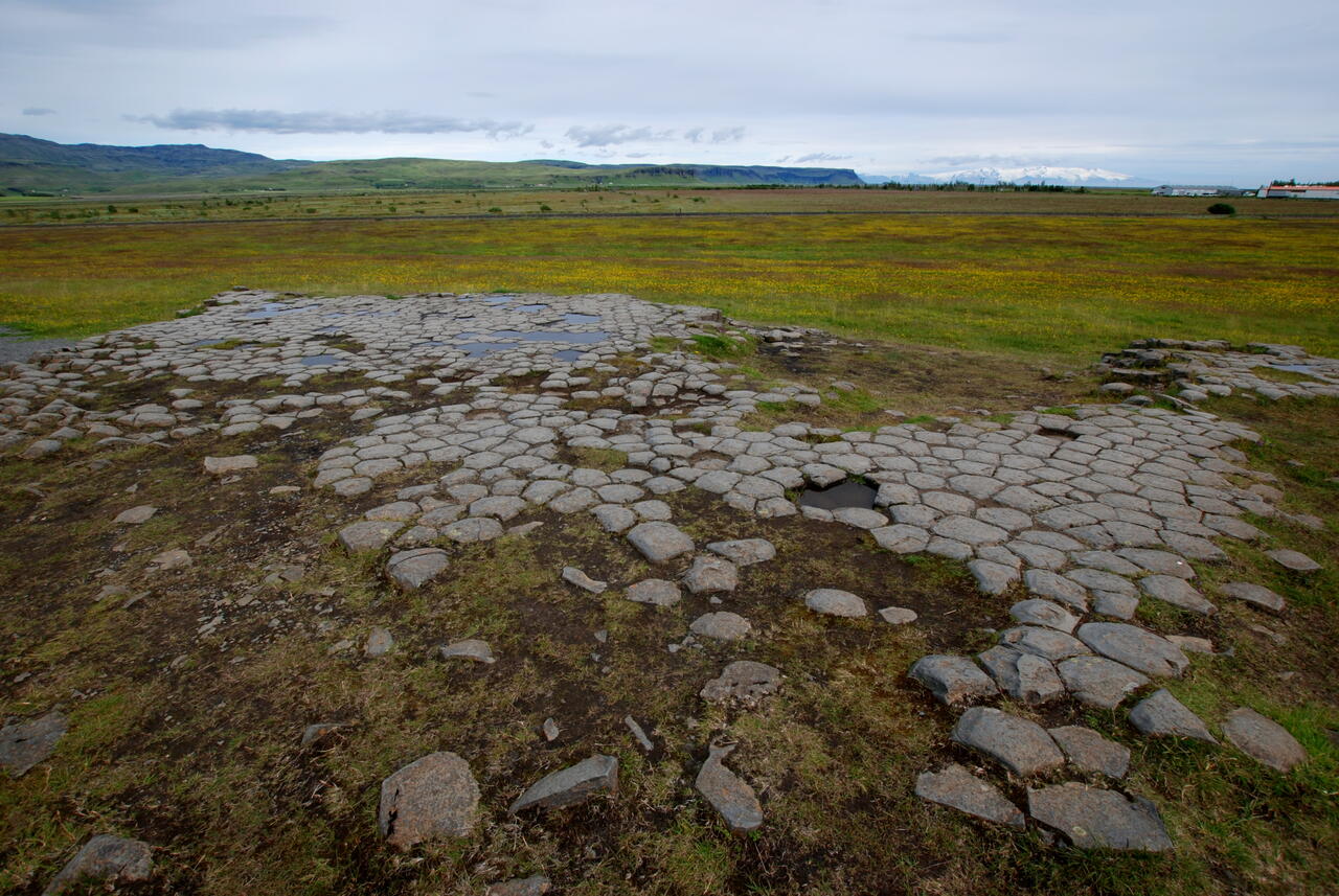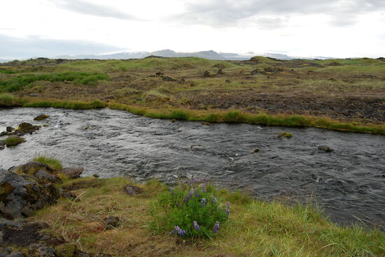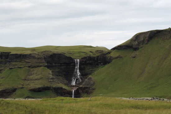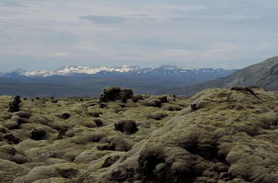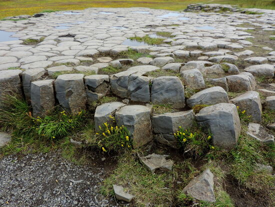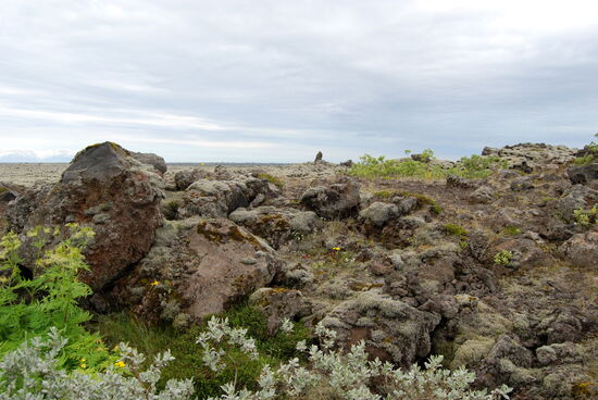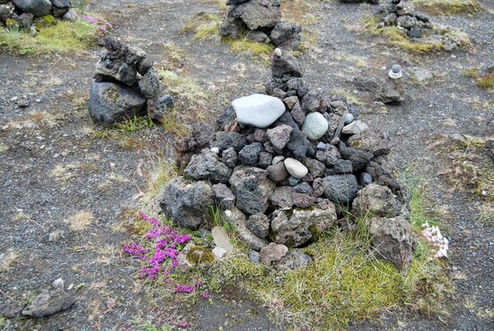 Bevor wir weiter nach Vík fuhren, wollten wir uns noch den Wasserfall am Ende des Ortes ansehen und den sog. Kirchenboden, Kirkjugólfi, eine 80 m² große Basaltfläche. Letztere sieht wirklich sehr schön aus. Dann ging es los. Von der N1 aus sahen wir noch einmal den Systrafoss. Dann hatten wir bald Eldraun erreicht, ein Lavafeld des Lakiausbruchs. Diese Lavafelder sind immer wieder beeindruckend: meist bizarr geformt, oft kann man Figuren erkennen, bestimmt wohnen Trolle und Elfen darin. Hier waren sie mit hellem Moos überzogen, wenn nicht Touristen es braun zertrampelt hatten. Zeitweise wurde die Lava von Gras abgelöst. An einem Parkplatz, wo lauter Steinmännchen aufgebaut waren, machten wir kurz Halt. Nun kam auch bald Hjörleifshöfði in Sicht. Hier war Ingólfur Arnarsons Bruder gelandet und verbrachte den ersten Winter, als er von Westmännern (Iren) umgebracht wurde. Nun hatten wir bald Vík erreicht und bogen auf den Campingplats ein. Er hatte sich nicht verändert seit 2010, nur etwas mehr Fläche, voller, und einige Hütten in Bau. Nach dem Kaffe fuhren wir noch zur Information und an den Strand mit dem Denkmal für deutsche Íslandfischer. Hier sahen wir Lundi in der Luft und auf dem Wasser schlafen. Nach einem Rundgang durch den großen Ausrüster- und Andenkenladen kauften wir noch im Supermarkt ein. Man hatte inzwischen ein riesiges Einkaufszentrum gebaut. Den Abend verbrachten wir bei blaubeermariniertem Lammfleisch und grünen Bohnen.