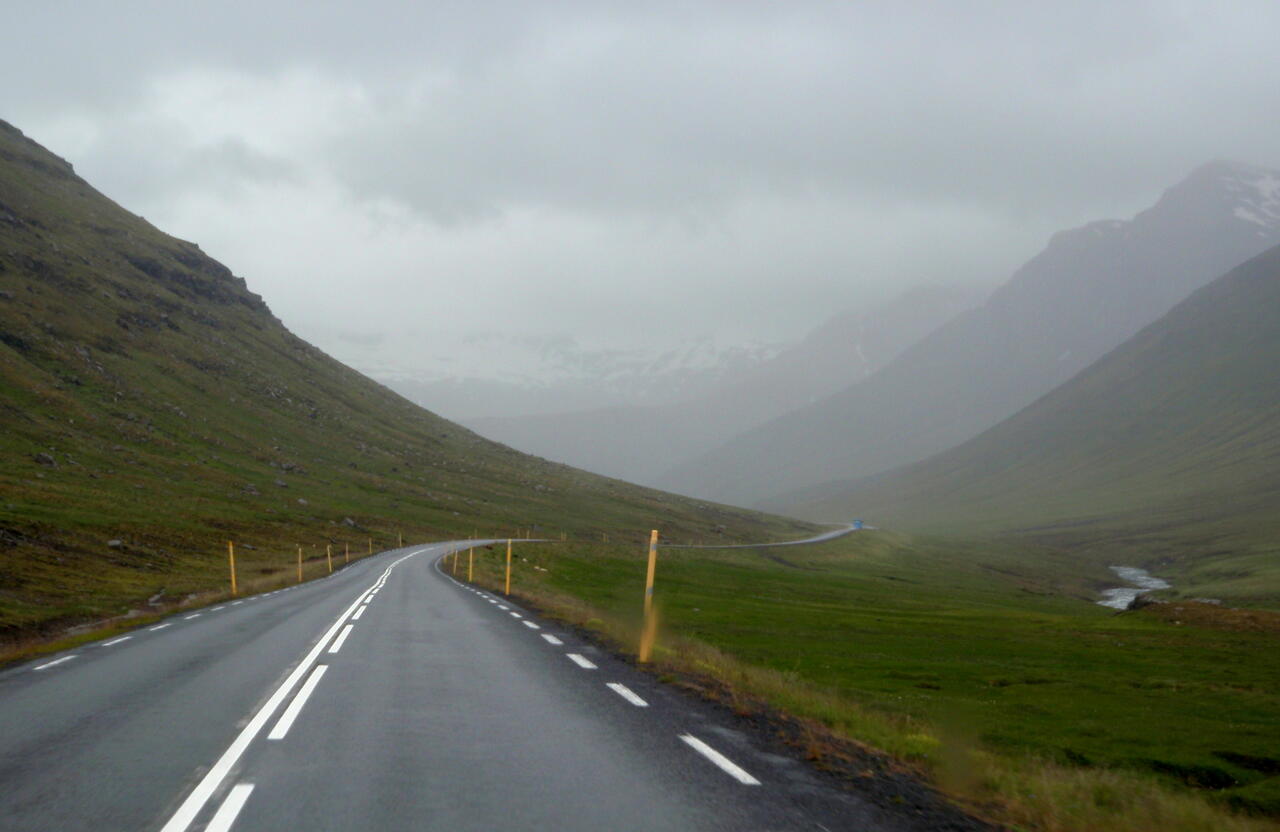 Der Wecker klingelte viel zu früh. Gleich darauf kam die Durchsage im Lautsprecher, daß wir in einer Stunde die Kabine verlassen müßten. Wir schleppten uns dann mit Sack und Pack auf den Flur. Gut, daß wir wieder unsere Campingstühle dabei hatten. Rainer ging nur kurz an Deck. Es war ungemütlich, aber gerade glitt „unser“ Leuchtturm Dalatangi für ein paar Fotos vorbei. Bald hatte die Fähre angelegt, und wir konnten unser Gespann rückwärts hinaus in den Regen rangieren. Die Zollkontrolle verlief problemlos, wir bekamen nur den üblichen Aufkleber. Im Touristenbüro des Terminals kauften wir noch die Campingkarte, dann fuhren wir bei Regen, etwas Nebel und 5° über den Berg nach Egilstaðir. Hier holten wir isländische Kronen, eine Karte für den Internetstift und kauften ein. Es gab sogar Hafermilch und Haferjoghurt, importiert aus Schweden. Sowohl bei Netto als auch bei Bonus füllten wir unsere Vorräte auf.