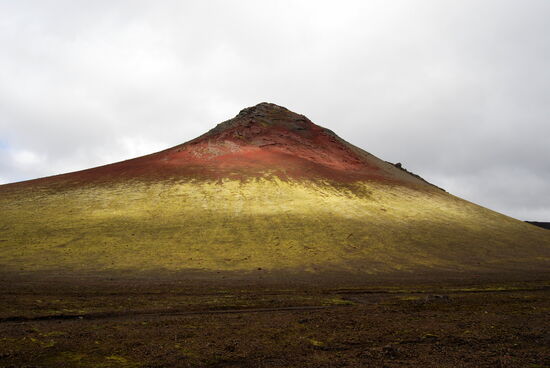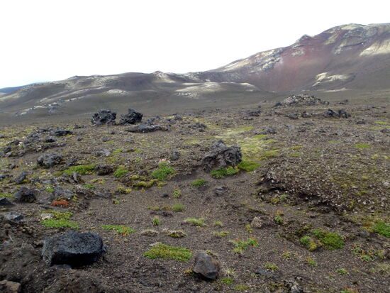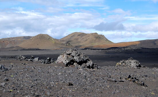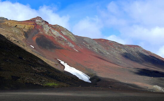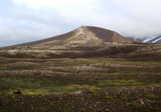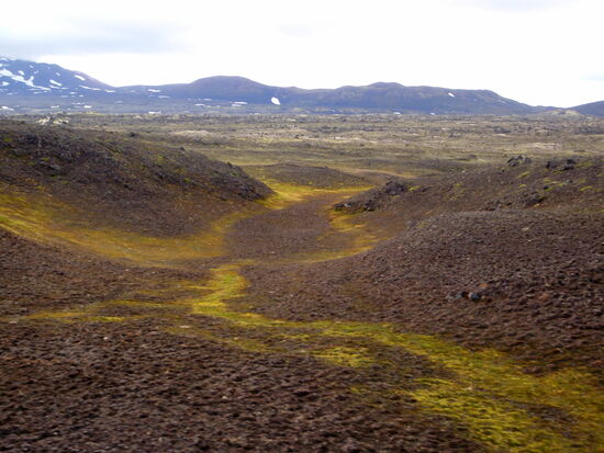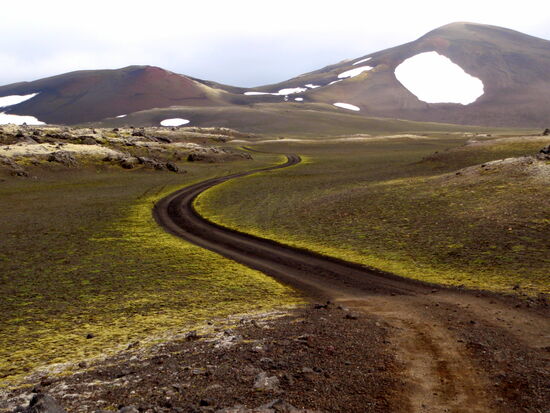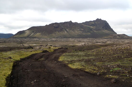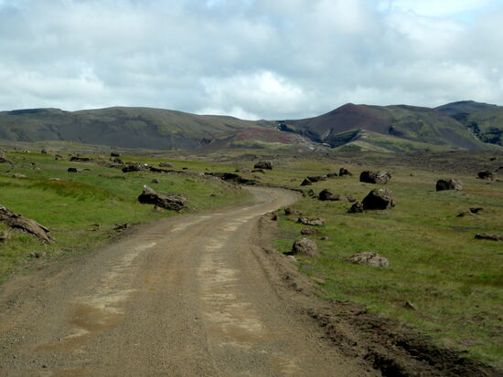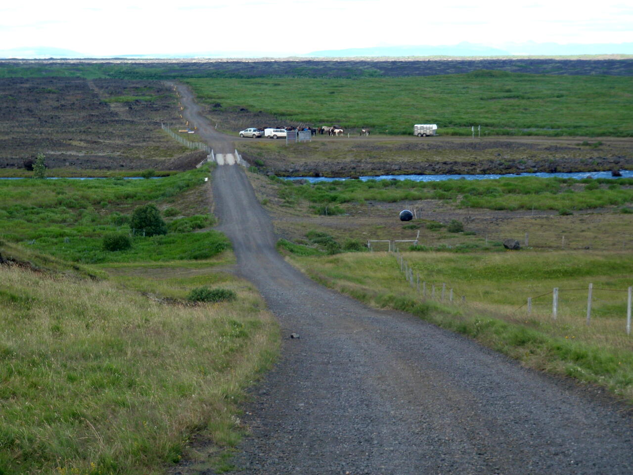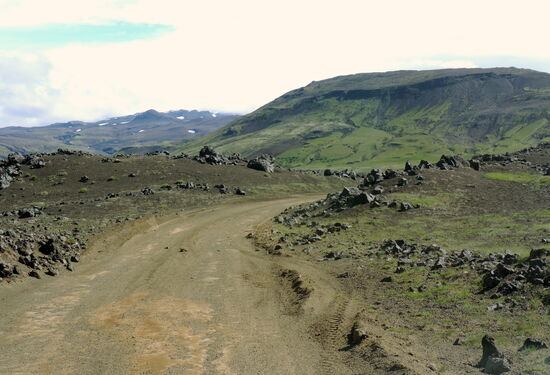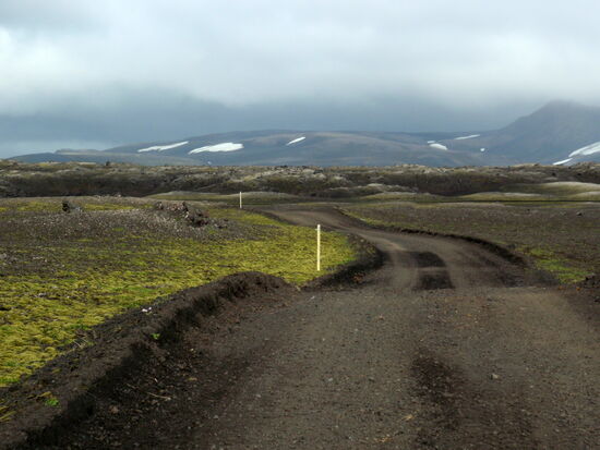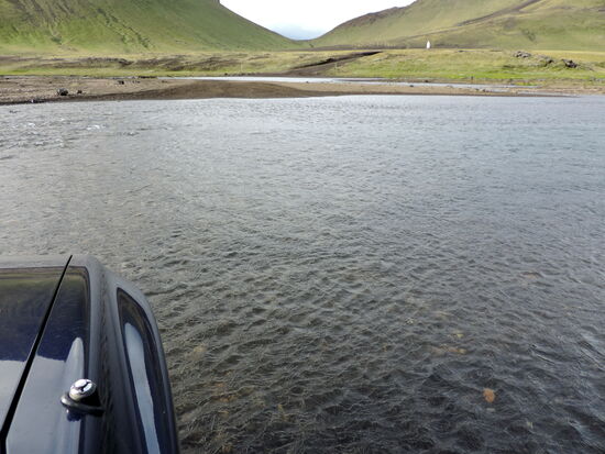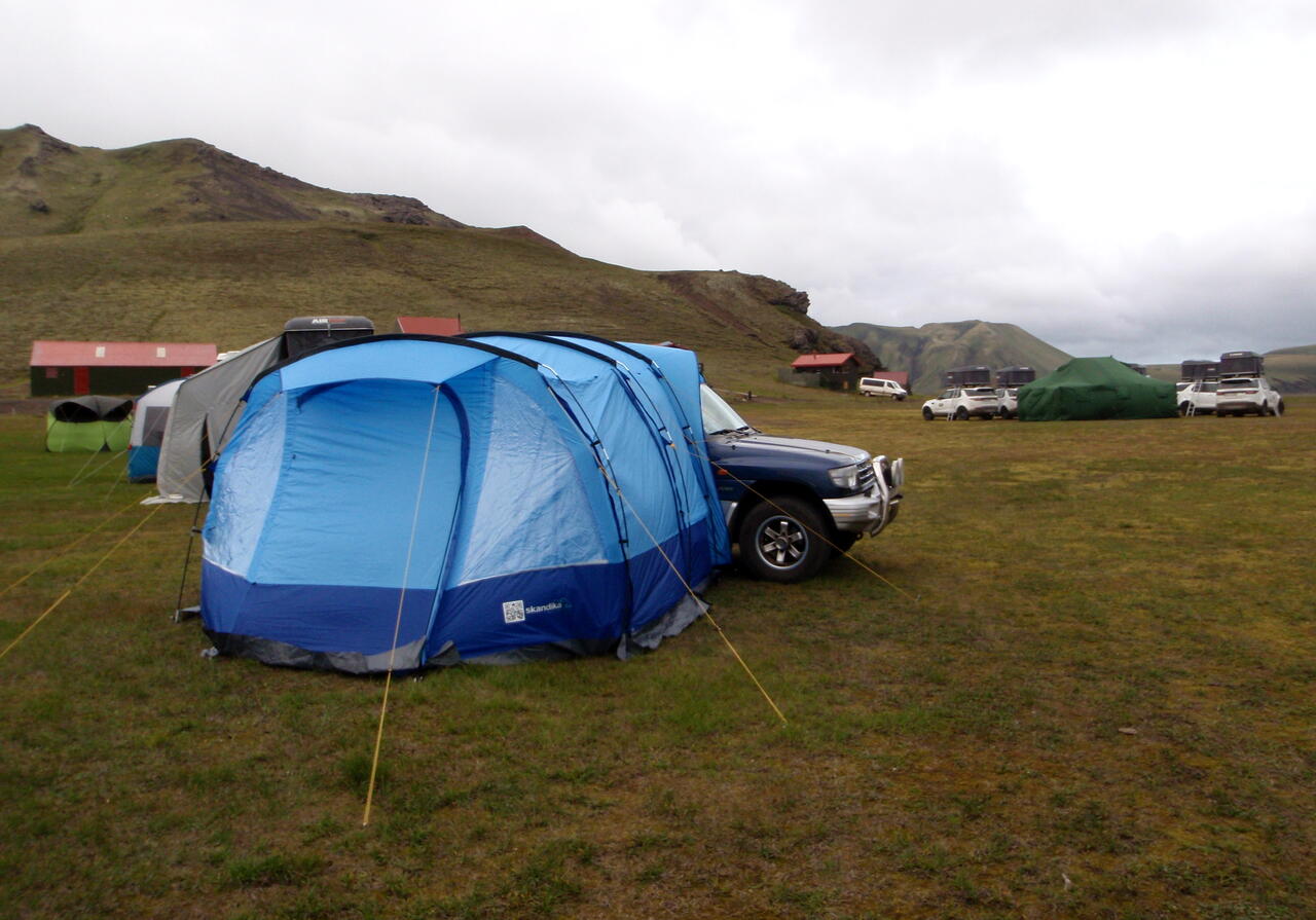 Auf einem Weg ohne Nummer begann die Fahrt und ging zuerst durch Wald bergauf. Hier war das Gebiet der Njálsaga, und auf den Wanderwegen sahen wir viele Isländer mit ihren Kindern. An den Parkplätzen standen Schilder, auf denen man nachlesen konnte, was hier einstmals geschah. An einem kleinen Wasserfall, der in eine malerische Schlucht stürzt, machten wir kurz Halt. Eine kurze Strecke weiter mußten wir dann durch zwei Vadställen des Flusses, welcher zu diesem Wasserfall gehört. Nun begann auch die Hochlandpiste, und es ging durch Lavafelder bis wir an die F210 stießen. Auf ihr ging es weiter durch die Lava. Der Weg war gut zu fahren. Wir hatten uns im Pisten-Führer von Pistenkuh.de eine interessant beschriebene Route ausgesucht, die in der Nähe der Hekla vorbei führt. Also bogen wir nach ca. 15 km auf eine Piste ohne Nummer ab. Zuerst führte die Piste relativ eben durch die Lava, während sich links zwei Gebirgszüge von 896 m und 1089 m erhoben. Schließlich ging es bergauf, und wir überquerten den Ausläufer der Berge. An einer Gabelung wollten wir eine kleine Rast einlegen. Daraus wurde aber eine gut zweistündige „Arbeitspause“. Christa sah den Abhang hinunter, wo unser Weg weiterging und entdeckte ein Fahrzeug, das in einer großen Schneemulde festsaß. Es waren Holländer mit Leihwagen, die schon eine Stunde auf Hilfe warteten. Rainer versuchte den Wagen wieder freizuschleppen, aber vergeblich. Der Wagen lag voll auf dem Schnee auf. Der Hang war zu steil und aus losem Geröll, so daß wir keine Chance hatten. Rainer traute sich aber auch nicht, über den Schnee zu fahren. Dann kamen zwei Motorradfahrer mit Geländemaschinen. Die schafften es, indem einer fuhr und der andere schob. Dann kam ein Isländer aus unserer Richtung. Er sah sich die Schneerillen genau an und fuhr dann rüber. Nun konnte er die Holländer rückwärts rausziehen. Daraufhin wagte es Rainer auch, das Schneefeld zu überfahren, und es ging auch gut. Man darf nicht mit den Rädern in der tiefen Spur fahren, sondern versetzt auf den höher liegenden Schneeflächen, solange sie noch tragen. Kaum drüben kam schon wieder ein Motorradfahrer aus Deutschland mit einer schweren Straßenmaschine und viel Gepäck. Obwohl er alles Gepäck ablud, Rainer und der Holländer mit schoben, dauerte es wohl eine halbe Stunde, bis die Maschine endlich drüben war. Gerade als wir wieder losfahren wollten, kam ein deutscher Landrover aus derselben Richtung wie die Holländer. Er konnte Vorder- und Hinterachse sperren und meinte, er würde rüberkommen. Aber denkste, auch er wühlte sich ein. Der Schnee war jetzt zu sehr aufgeweicht. Rainer holte ihn rückwärts wieder raus. Einen neuen Versuch wollte niemand mehr wagen. So fuhren jetzt alle in Richtung Norden. Obwohl wir auch nach GPS fuhren, verpaßten wir die geplante Abfahrt. Rainer merkte es aber bald, so fuhren wir ein Stück zurück. Nun begann für Christa die abenteuerlichste Fahrt. Die Strecke ist nicht umsonst als sehr anspruchsvoll beschrieben. Zuerst ging es an einem 3-4 m hohen Lavaband entlang, sehr beeindruckend! Rechts von uns die Bergkette Rauðfossafjöll mit drei Gipfeln über 1000 m und linker Hand der bizarre, interessant aussehende Krakatindur. Die Strecke wurde immer schwieriger, tiefe Rillen und große Steine verlangten Rainers ganzes Können. An einer stark verblockten Passage dachten wir schon, daß sie für uns nicht zu bewältigen sei. Aber mit Untersetzung, Differentialsperre und viel Gefühl schafften wir es. Spannend, aber auch recht anstrengend, nicht nur für den Fahrer. Dann kamen wir an eine kleine Furt. Nach ihr ging es sehr steil nach oben und mit einem kleinen Absatz dann extrem steil einen langen Hang hinauf. Christa meinte: „Das schaffen wir doch nie!“ Aber unser guter alter Pajero konnte darüber nur lachen. Im nachhinein sind solche Pisten viel schöner zu fahren, als solche, auf denen sich Auto an Auto durch unendlich viele Schlaglöcher quälen. Nach der steilen Auffahrt ging es langsam wieder hinab in eine große Ebene. Einmal konnten wir in der Ferne schon unseren angestrebten Übernachtungsplatz Landmannahellir sehen. Der Weg war nun ohne Schwierigkeiten zu befahren, eine kleine Vadställe und später noch eine größere kurz vor der Fjällstation, dann waren wir da. Eine große Wiese bot reichlich Platz. Es hatte angefangen, recht windig zu werden, und so war es gar nicht so leicht, unser Zelt aufzubauen. Als es geschafft war, meldeten wir uns erst einmal an. Erfreulicher Weise sprach der Hüttenwirt schwedisch. Er meinte, es solle in der Nacht sehr windig werden. Zum Glück ließ der Wind aber sogar noch nach, so daß wir eine ruhige Nacht hatten. Wir genossen es sehr, daß unser neues Zelt Stehhöhe hat und wir darin auch noch einen Tisch und Stühle stellen können.