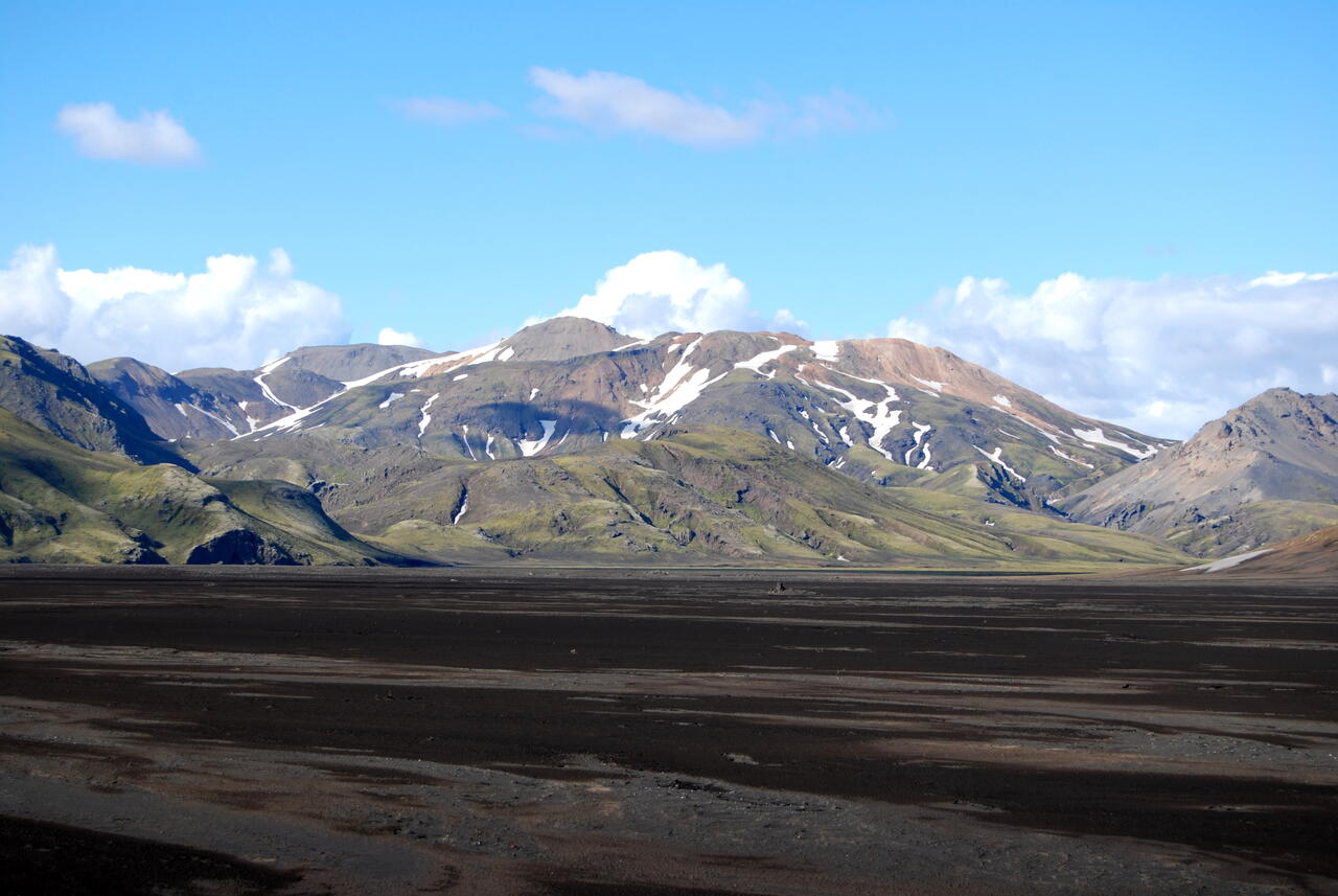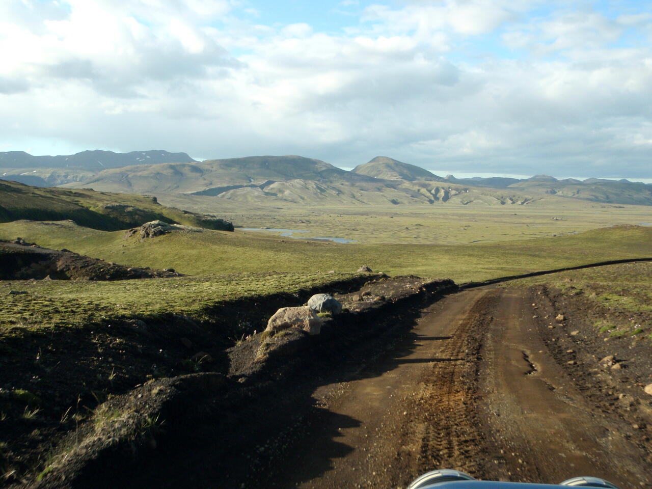 Bei herrlichem Wetter fuhren wir nun wieder ins Hochland. Vom Campingplats bogen wir auf die 261 in Richtung Osten ab. Kurz vor der Einmündung der 250 erreichten wir den schönen Wasserfall Gluggafoss. Der Fels des Wasserfalls besteht teilweise aus Tuff, was relativ weich ist. So werden Fenster, gluggi, ausgewaschen. Wasserfälle sind immer wieder beeindruckend, und dieser war auch wieder besonders schön. Von hier hatten wir auch einen tollen Blick auf den Eyjafjallajökull, der uns bei der weiteren Fahrt begleitete. Bald ging die Straße in Schotter über und führte schließlich ein ganzes Stück durch das Flußbett des Markarfljót. Wir passierten den Tuffelsen Þórólfsfell, der schon im Landnámabók und der Njálssaga erwähnt wurde. Weiter ging die Fahrt dicht am Berg oder im Flußbett entlang mit dem Eyjafjallajökull auf der anderen Seite. Wir konnten sogar die Gletscherzunge entdecken, unter der wir bei unserer Þórsmörk-Fahrt Rast gemacht hatten. Als wir auf der gegenüberliegenden Þórsmörk-Seite die Station Húsadalur liegen sahen, stieg die Piste an, das Tal wurde enger und der Fluß schmaler. Die Piste ging auf und ab, teilweise ging sie in der Schlucht durch einige Vadställen, dann führte sie weiter hinauf auf die Hochfläche. Bizarre Felsformationen begleiteten uns immer wieder. Einhyrningur, das Einhorn, ist ein Pelagonitrücken, den wir in einer Schleife fast umrundeten. Wir fuhren jetzt auf ungefähr 500 m über eine Hochfläche. Inzwischen begleitete uns der Gletscher Mýrdalsjökull. Auf einem Plateau an der Schlucht der Markarfljót, Markarfljótsgljúfur, machten wir Rast im herrlichen Sonnenschein. Dann führte der Weg über eine Brücke und anschließend wieder bergan. Weiter ging die Piste über die Hochebene, durch Lavafelder und Sandflächen mit kleineren Vadställen. Über einen wilden Fluß führte wieder eine Brücke. Hier waren auch Wanderer unterwegs. Wo es Wasser gab, gab es auch grüne Pflanzen und bunte Blumen. Kurz bevor wir die Gabelung der F 261 mit der F 210 erreichten, mußten wir noch eine größere Vadställe durchqueren, aber nicht, bevor Rainer mit der Wathose den richtigen Weg erkundet hatte. Wenige hundert Meter weiter waren wir am nächsten Fluß. Diesen mußten wir jetzt aber nicht durchqueren, das wollten wir uns für den Rückweg aufheben. Hier gab es für Wanderer eine feste Brücke. Wir fuhren jetzt auf der F 210 parallel zum Fluß in Richtung Osten. Nach einer kurzen Strecke führte die Piste über Plattenlava. Dies ist zwar ein fester Untergrund, aber furchtbar rubbelig. So kommt man nur langsam voran. Zum Glück war diese Strecke nicht allzu lang, dann ging es geradlinig durch Sanderflächen mit einigen kleinen Vadställen auf den Berg Mælifell zu. Im 90º-Winkel fuhren wir herum und weiter durch eine weite Sandfläche, die mit kleinen, teilweise trockenen Wasserläufen durchzogen war. Natürlich war der Sand hier überall schwarz! Dann stieg die Piste wieder an, und wir erreichten bald die Gabelung der Pisten F 210 und F 232. Nun ging es gebirgig auf und ab. Mehrfach durchquerten wir Flüsse, teilweise auch größere, die Rainer vor der Durchfahrt erkundete. Wir fuhren weiter auf der F 233 in Richtung Norden. Wir wollten zum Schwanensee, Álftavötn. Von einem kleinen Stichweg konnten wir auf den See und die Station sehen. An der Abfahrt waren wir aber schon vorbeigefahren. Also mußten wir zurück und ca. einen halben Kilometer einen ausgewaschenen Weg zum See hinunter fahren. Hier bauten wir unser Zelt auf. Der Platz war kostenlos, hatte eine Unterkunftshütte und draußen sogar ein Klo mit Wasserspülung. Es war gerade eine Wandergruppe aus Deutschland dort. Die Wanderer erzählten uns, daß sie vor 2 Tagen mit ihren Zelten fast davongeflogen waren. Sie mußten mitten inder Nacht schnell alles abbauen und sich in einer Hütten verschanzen. Davor hatten uns ja die Elfen bewahrt!