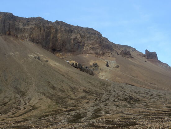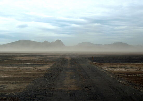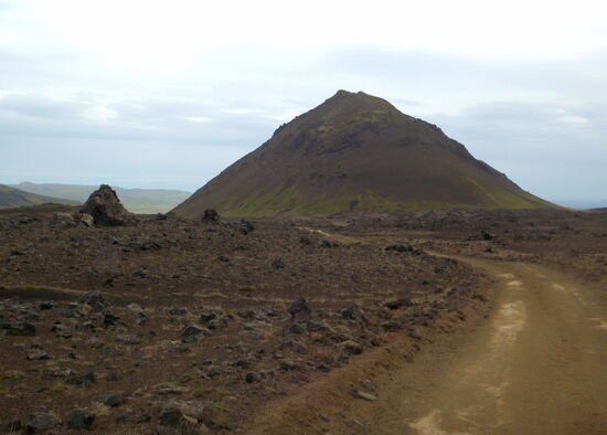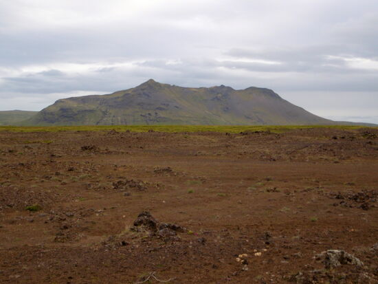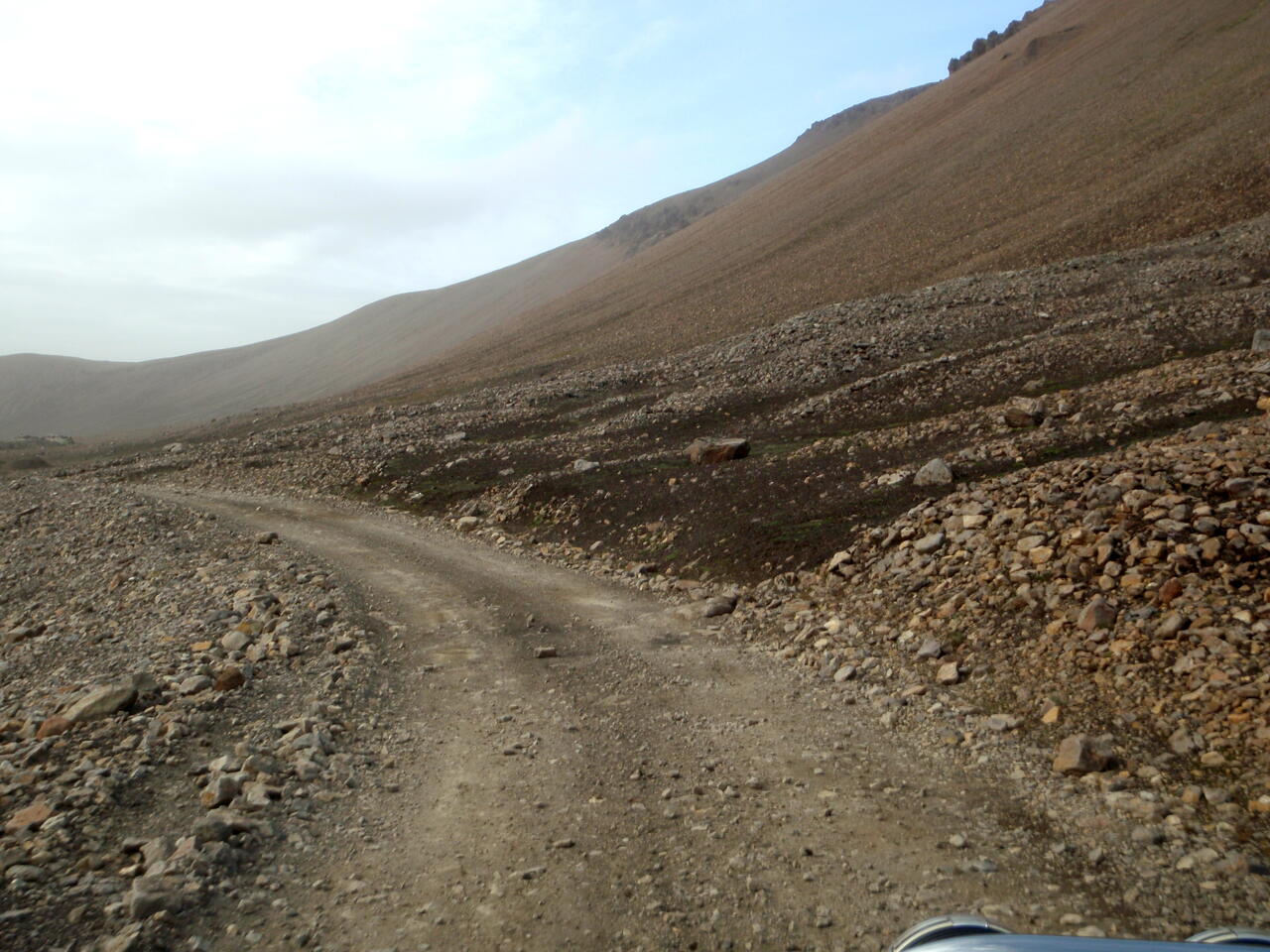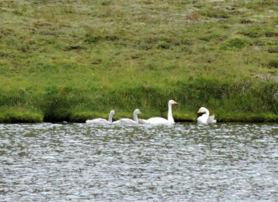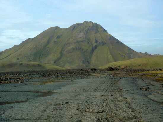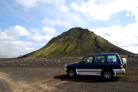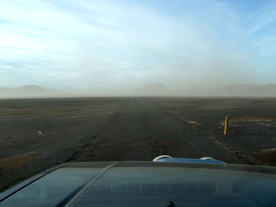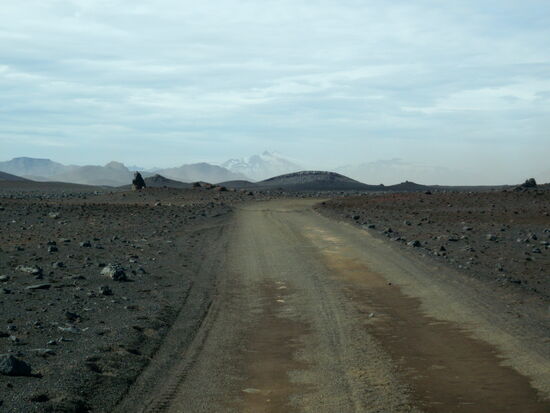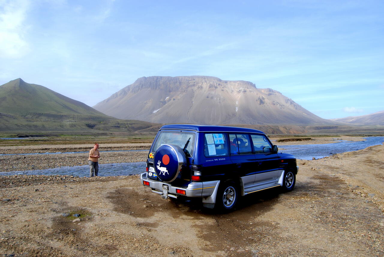 Am Morgen waren schon wieder alle Wanderer weg. Wir packten unser Zelt und alles Zubehör ein. Ein Weilchen beobachteten wir noch die Schwäne mit ihren Jungen. Dann kletterte unser Pajero den ausgewaschenen Weg hinauf zur Piste F 233. Auf und ab ging es über die Hochfläche mit einigen unproblematischen Flußdurchfahrten. Bald erreichten wir die F 210, die hier auch durch Lavafelder führte. Plötzlich wurden wir von einer Horde vierrädriger Rennmaschinen bedrängt, die uns schließlich mit Getöse neben der Spur überholten. Eine größere Vadställe durchquerten wir ohne Probleme, dann kamen wir zum Sander hinunter. Schnurgerade führte die Piste auf den Mýrdalsjökull und den Bergkegel Mælifell zu. Es war windig geworden, am Horizont zogen Sandwolken über das Land. Im rechten Winkel fuhren wir um den Berg herum, und weiter ging es durch den Sander mit einigen Durchquerungen mehrerer Flußläufe. Der Himmel wurde immer mehr von Sandwolken verschleiert. Nach einer Weile erreichten wir wieder die Plattenlava. Nun dauerte es nicht mehr lange, und wir hatten die Vadställe erreicht, wo die F 210 nach Norden abbiegt und die F 261, auf der wir gekommen waren, nach Südwesten führt. Rainer erkundete erst einmal ausgiebig die Vadställe. Der Untergrund war schwer zu beurteilen, sehr unregelmäßig mit einigen Steinen. Bei der Durchfahrt hatten wir dann auch einen leichten Aufsetzer.