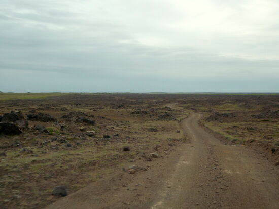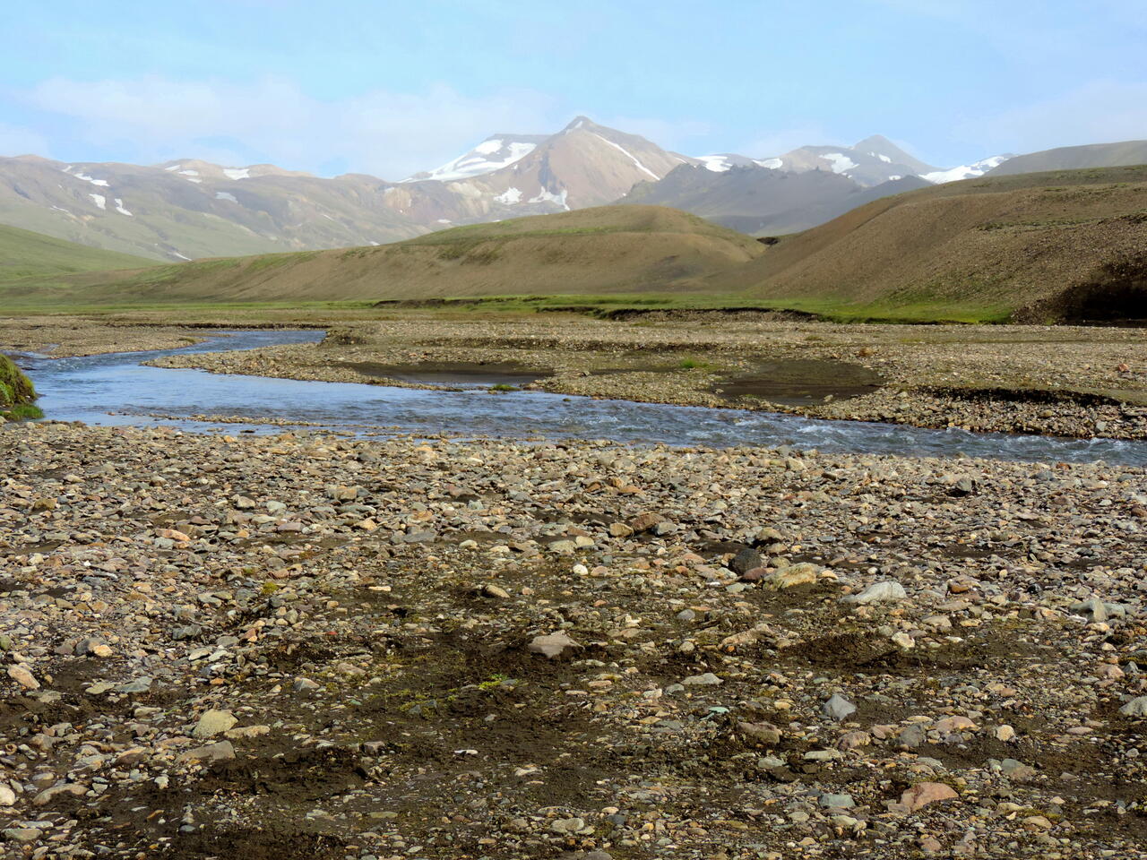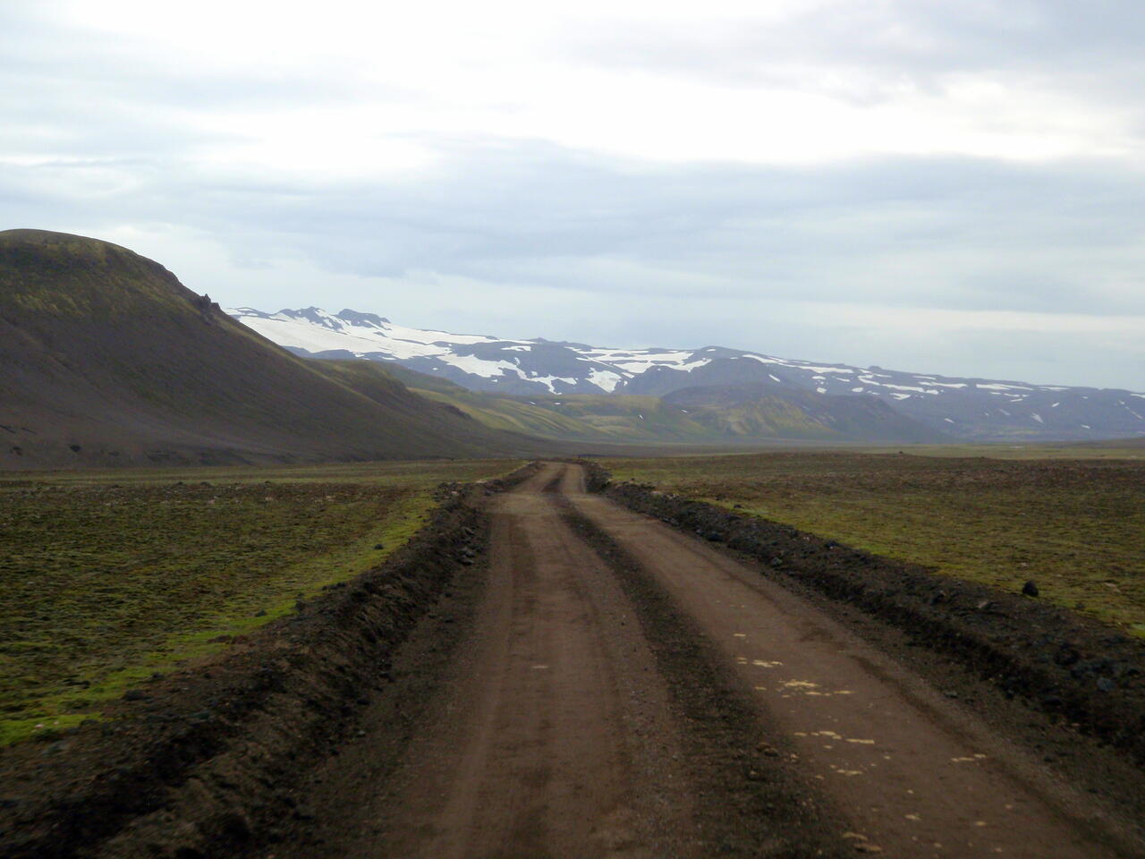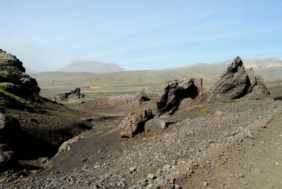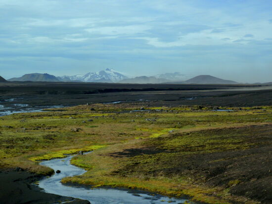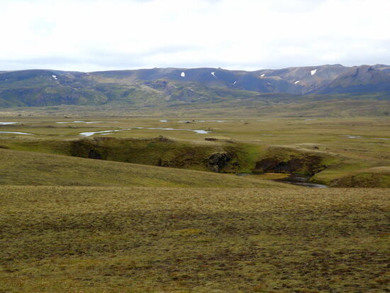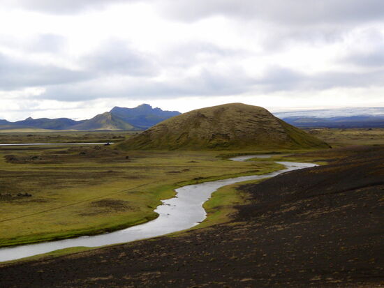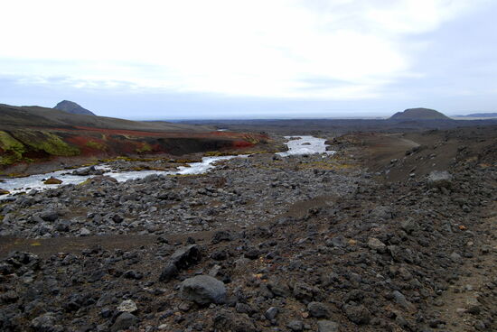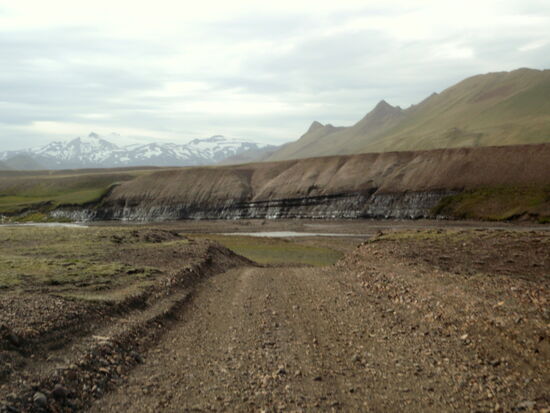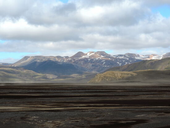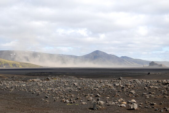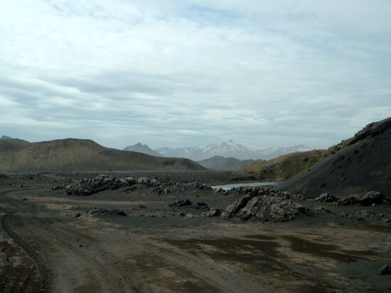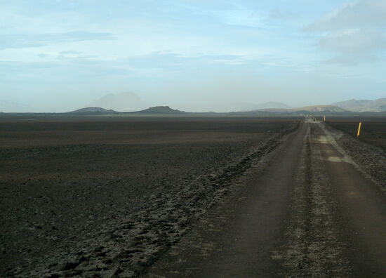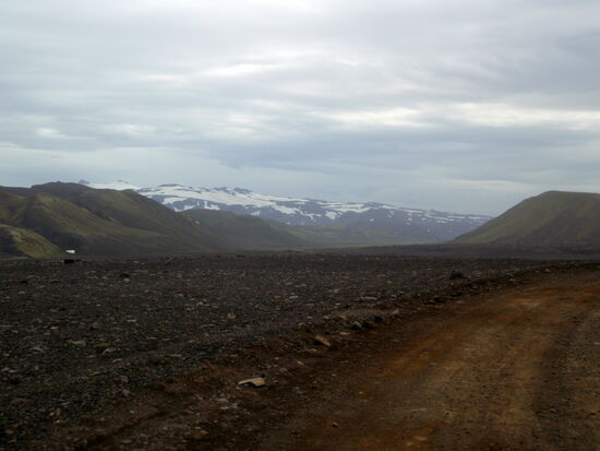 Kurz darauf kamen wir an der Hütte Hvanngil vorbei. Hier war es sehr gebirgig, die Piste ging auf und ab. Die etwas entfernteren Berg verschwanden fast in den Sandwolken. Es gab mehrere leichte Flußdurchfahrten. Als wir über einen Berg kamen, sahen wir die nächste Vadstelle. Gleich daneben durchwateten Wanderer den Fluß. Bald darauf kamen wir an der nächsten Hütte vorbei. Sie heißt so, wie der See an dem sie liegt, Álftavatn, Schwanensee. Der See war verschleiert vom Sandsturm. Weiter führte die Piste in leichtem Auf und Ab über die Hochfläche mit schönen Ausblicken auf die farbigen Berge. In einem breiten Flußbett machten wir auf dem Schotter Rast. Dies gehört zum Sammelflußsystem Markarfljót. Zu Beginn dieser Hochlandfahrt waren wir schon am Unterlauf entlang gefahren, ebenso wie bei der Þórsmörk-Fahrt. Hier gab es mehrere Flußarme, die wir danach durchqueren mußten. Als wir dann den Hang wieder hinauf fuhren, sahen wir andere Fahrzeuge, die durch die Vadställen fuhren. Sie überholten uns wenig später und fuhren vor uns her, als die Piste ein Stück längs durch den Fluß führte. Als der Weg anstieg, holten wir sie wieder ein. Sie hatten angehalten und reparierten die Fahrbahn, indem sie einen Abfluß für das Wasser schafften, das den Weg hinunter lief. Die weitere Strecke führte immer wieder durch Lavafelder, in denen sich teilweise riesige Brocken aufgetürmt hatten. Ein Flüßchen begleitete uns mehr oder weniger in Sichtweite links neben der Piste. Nach einer Weile kamen wir an den Abzweig, wo wir die F 210 vor einigen Tagen verlassen hatten in Richtung Landmannahellir. Nun waren wir das letzte Stück auf bekanntem Weg. Es dauerte nicht mehr allzu lange und von links stieß die Abkürzungspiste auf die F 210. Wir fuhren aber weiter am Torfhof Keldur vorbei. Über die 264 erreichten wir die Ringstraße N 1. In Hvolsvöllur tankten wir, dann ging es zurück zum Campingplats. Eine schöne dreitägige Hochlandfahrt ging zu Ende.