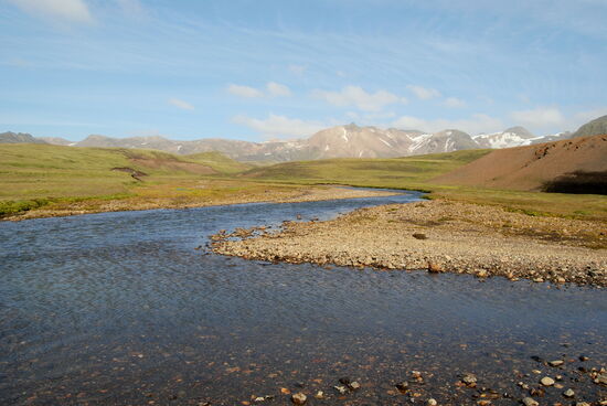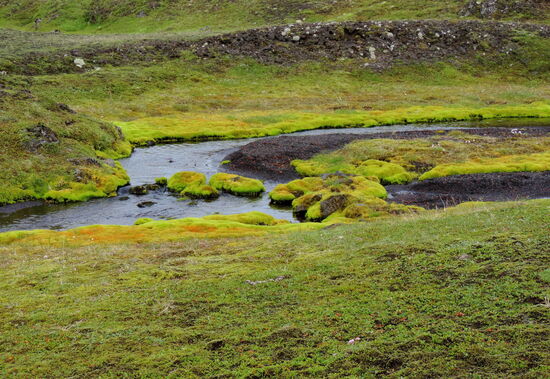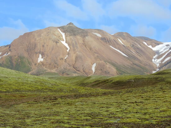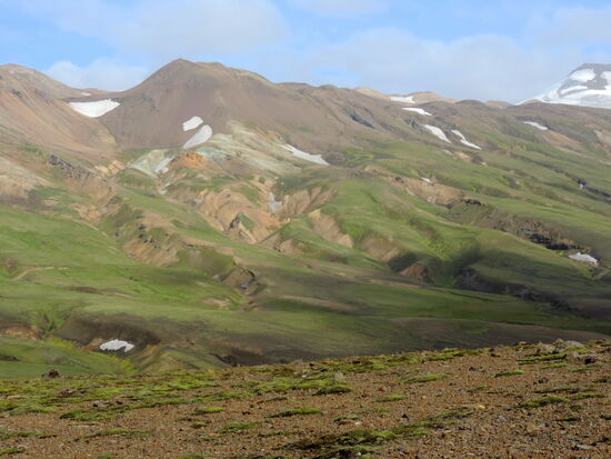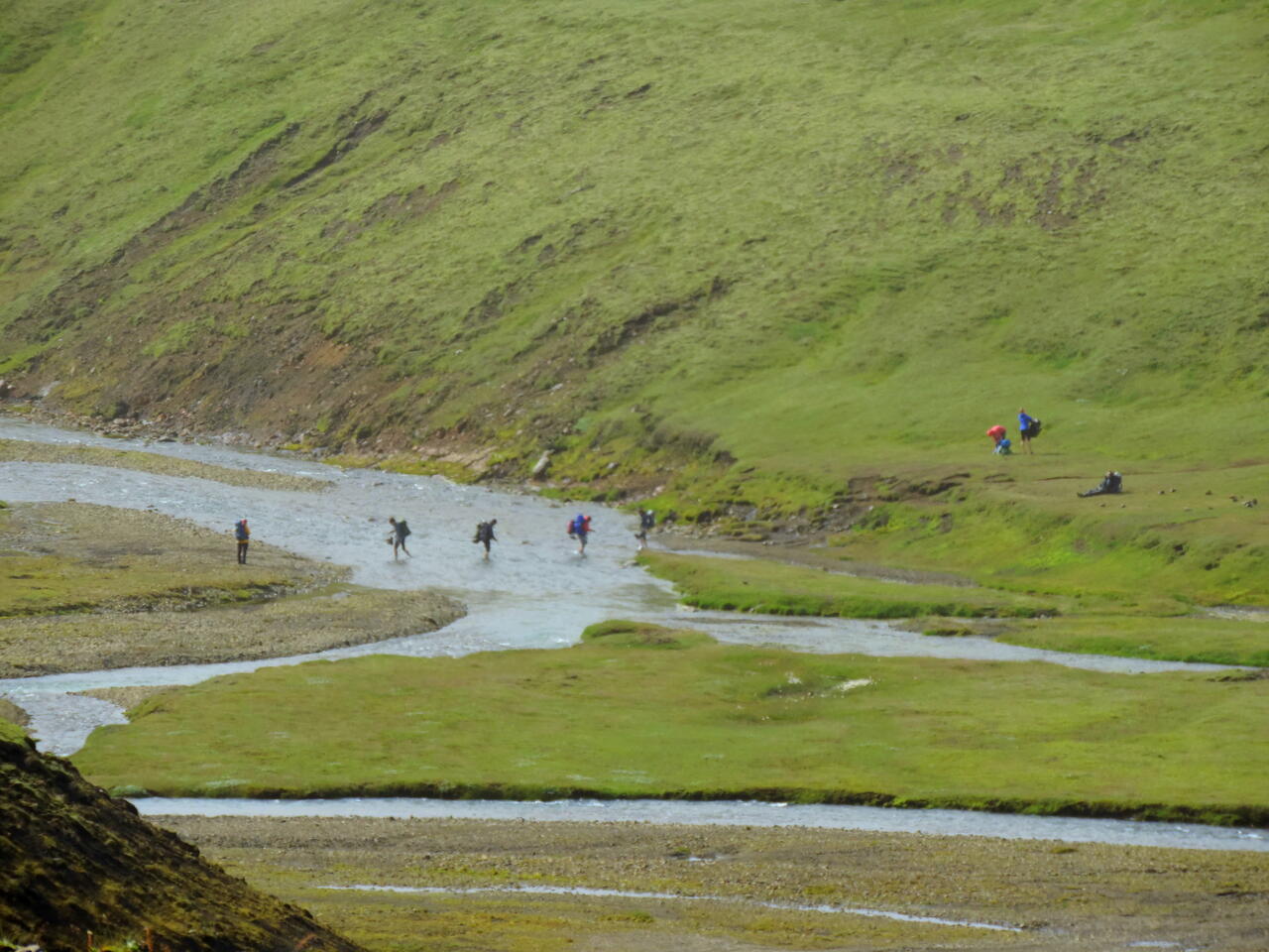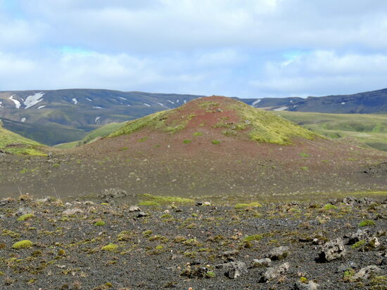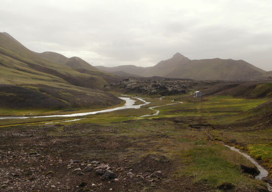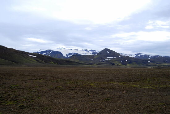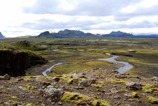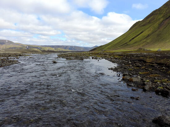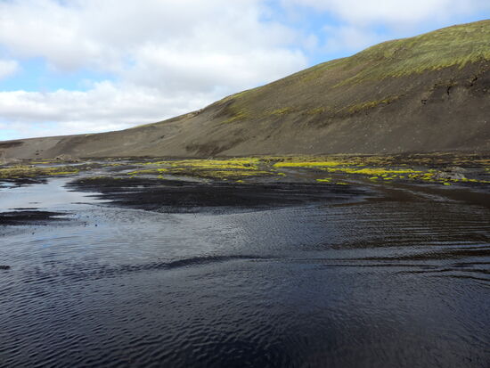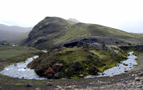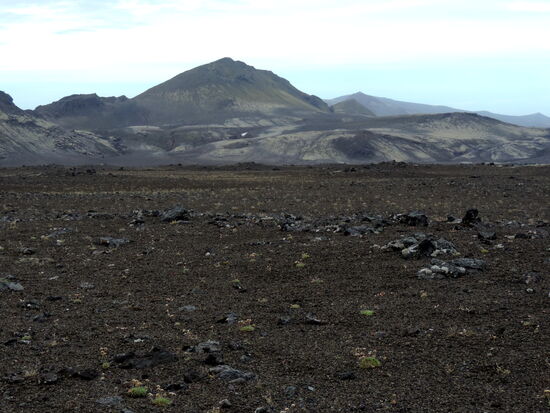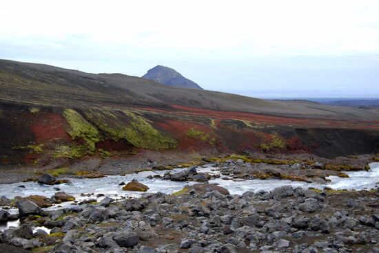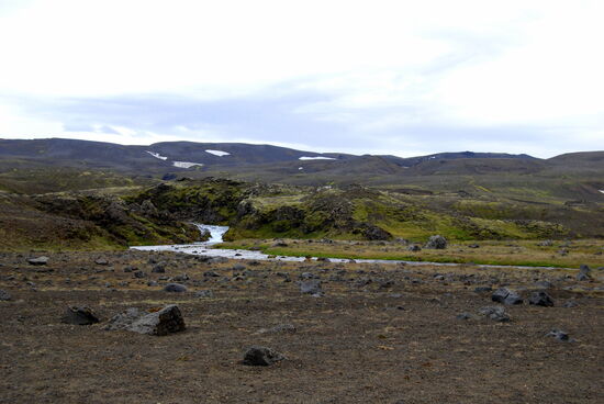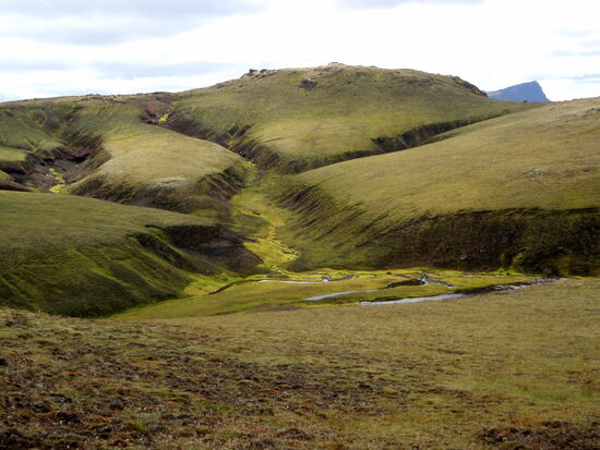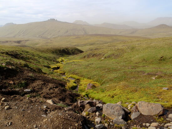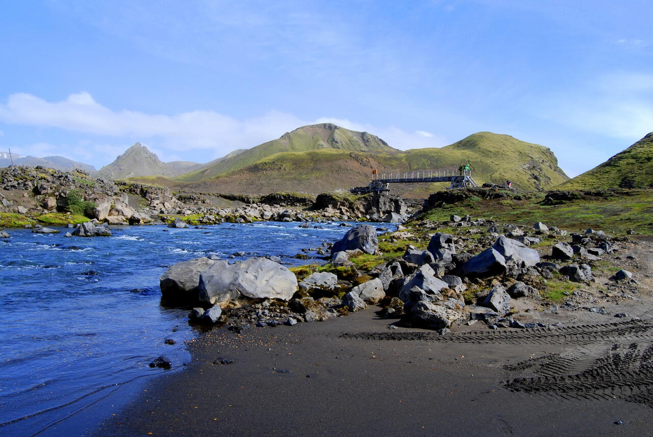 Kurz darauf kamen wir an der Hütte Hvanngil vorbei. Hier war es sehr gebirgig, die Piste ging auf und ab. Die etwas entfernteren Berg verschwanden fast in den Sandwolken. Es gab mehrere leichte Flußdurchfahrten. Als wir über einen Berg kamen, sahen wir die nächste Vadstelle. Gleich daneben durchwateten Wanderer den Fluß. Bald darauf kamen wir an der nächsten Hütte vorbei. Sie heißt so, wie der See an dem sie liegt, Álftavatn, Schwanensee. Der See war verschleiert vom Sandsturm. Weiter führte die Piste in leichtem Auf und Ab über die Hochfläche mit schönen Ausblicken auf die farbigen Berge. In einem breiten Flußbett machten wir auf dem Schotter Rast. Dies gehört zum Sammelflußsystem Markarfljót. Zu Beginn dieser Hochlandfahrt waren wir schon am Unterlauf entlang gefahren, ebenso wie bei der Þórsmörk-Fahrt. Hier gab es mehrere Flußarme, die wir danach durchqueren mußten. Als wir dann den Hang wieder hinauf fuhren, sahen wir andere Fahrzeuge, die durch die Vadställen fuhren. Sie überholten uns wenig später und fuhren vor uns her, als die Piste ein Stück längs durch den Fluß führte. Als der Weg anstieg, holten wir sie wieder ein. Sie hatten angehalten und reparierten die Fahrbahn, indem sie einen Abfluß für das Wasser schafften, das den Weg hinunter lief. Die weitere Strecke führte immer wieder durch Lavafelder, in denen sich teilweise riesige Brocken aufgetürmt hatten. Ein Flüßchen begleitete uns mehr oder weniger in Sichtweite links neben der Piste. Nach einer Weile kamen wir an den Abzweig, wo wir die F 210 vor einigen Tagen verlassen hatten in Richtung Landmannahellir. Nun waren wir das letzte Stück auf bekanntem Weg. Es dauerte nicht mehr allzu lange und von links stieß die Abkürzungspiste auf die F 210. Wir fuhren aber weiter am Torfhof Keldur vorbei. Über die 264 erreichten wir die Ringstraße N 1. In Hvolsvöllur tankten wir, dann ging es zurück zum Campingplats. Eine schöne dreitägige Hochlandfahrt ging zu Ende.