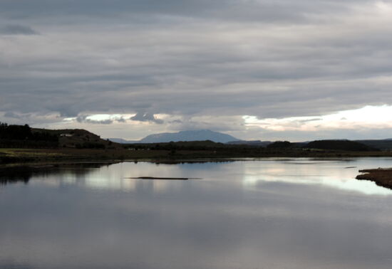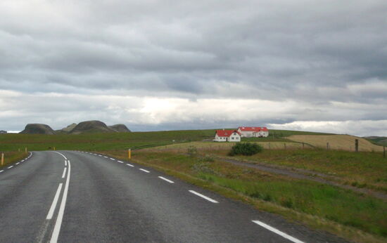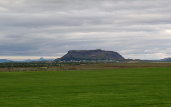 Wir hatten die ganze Zeit ohne Stromanschluß gestanden. Die Batterie wurde von unseren Solarzellen geladen, und Kühlschrank und Heizung liefen über Gas. Als nun unsere Komposit-Flasche leer wurde, fiel uns ein, daß hier alle gleichartige Flaschen verwenden. Ob wohl unser schwedischer Anschluß paßt? An der Tankstelle tauschten wir die Flaschen, und alles funktionierte. Es war zwar deutlich teurer als bei uns, aber wenn man täglichen Stromanschluß von 800-1000 ISK aufrechnet, kamen wir so deutlich günstiger weg. Das hätten wir schon früher machen sollen. Von Hvolsvöllur fuhren wir auf der N 1 nach Hella. Dort kauften wir noch einmal ein. Kurz danach bogen wir auf die 26 ab. Bei Leirubakki gab es ein Hekla-Vulkan-Zentrum. Schon beim Blick zum Eingang sah alles ziemlich duster aus. Auf Nachfrage wurde uns bestätigt, daß es sehr dunkel ist, mit Bildschirmen usw. und alles nur auf Englisch. Offensichtlich ist dies ähnlich „modern“ eingerichtet, wie das Lava-Zentrum in Hvolsvöllur. So verzichteten wir auf den Besuch und tranken nur Kaffe und aßen Rhabarberkuchen. Im nachhinein stellten wir fest, daß uns die beiden jungen Frauen aus Österreich wohl „übers Ohr gehauen“ hatten. Umgerechnet ca. 46 Euro ist ja wohl etwas teuer.