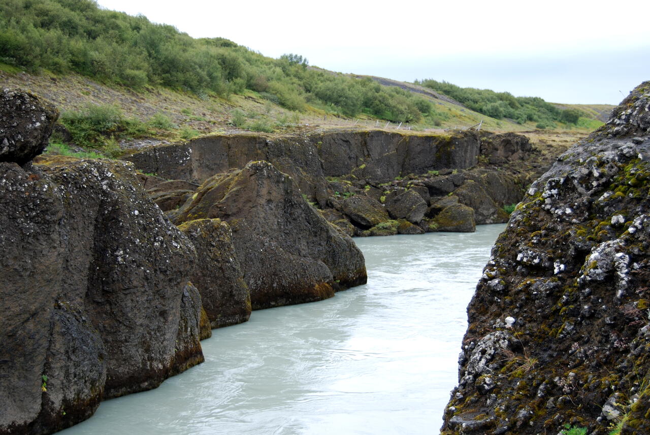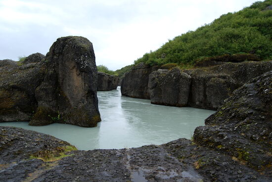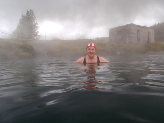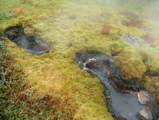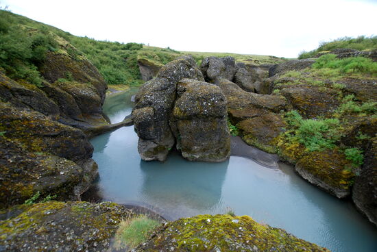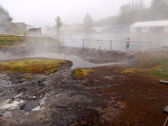 Wir hatten vom Platzwart ein Informationsblatt bekommen, daß hier in der Nähe das älteste Naturbad Íslands liegt. So packten wir das Badezeug und fuhren hin. Auf dem Weg kamen wir noch bei Brúarhlöð vorbei. Die Hvítá, welche vom Gullfoss kommt, fließt hier reißend durch eine Schlucht mit vielen bizarr ausgewaschenen Tuffelsen. Auch bei Regen war das schön anzusehen. Wir waren 2010 schon einmal hier. Danach ging es zum Bad. Als Pensionäre brauchten wir nur ca. 12 Euro pro Person zu bezahlen. Die Anlage war sauber, schön und großzügig. Bei dem Wetter waren natürlich viele auf die Idee gekommen, aber bei 40º warmem Wasser hält man es nicht viel länger als 2 Stunden darin aus. Ein kleiner Bretterweg führt um den Lauga-Pott herum, und man kann sich die kochenden Quellen ansehen. Eine heißt „Litli Geysir“ und spritzt tatsächlich ab und zu bis zu 1 m hoch. Andere kochen nur, und die ganze Gegend riecht natürlich leicht nach Schwefel.