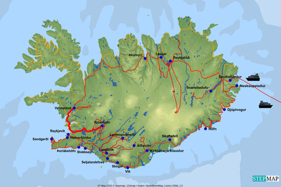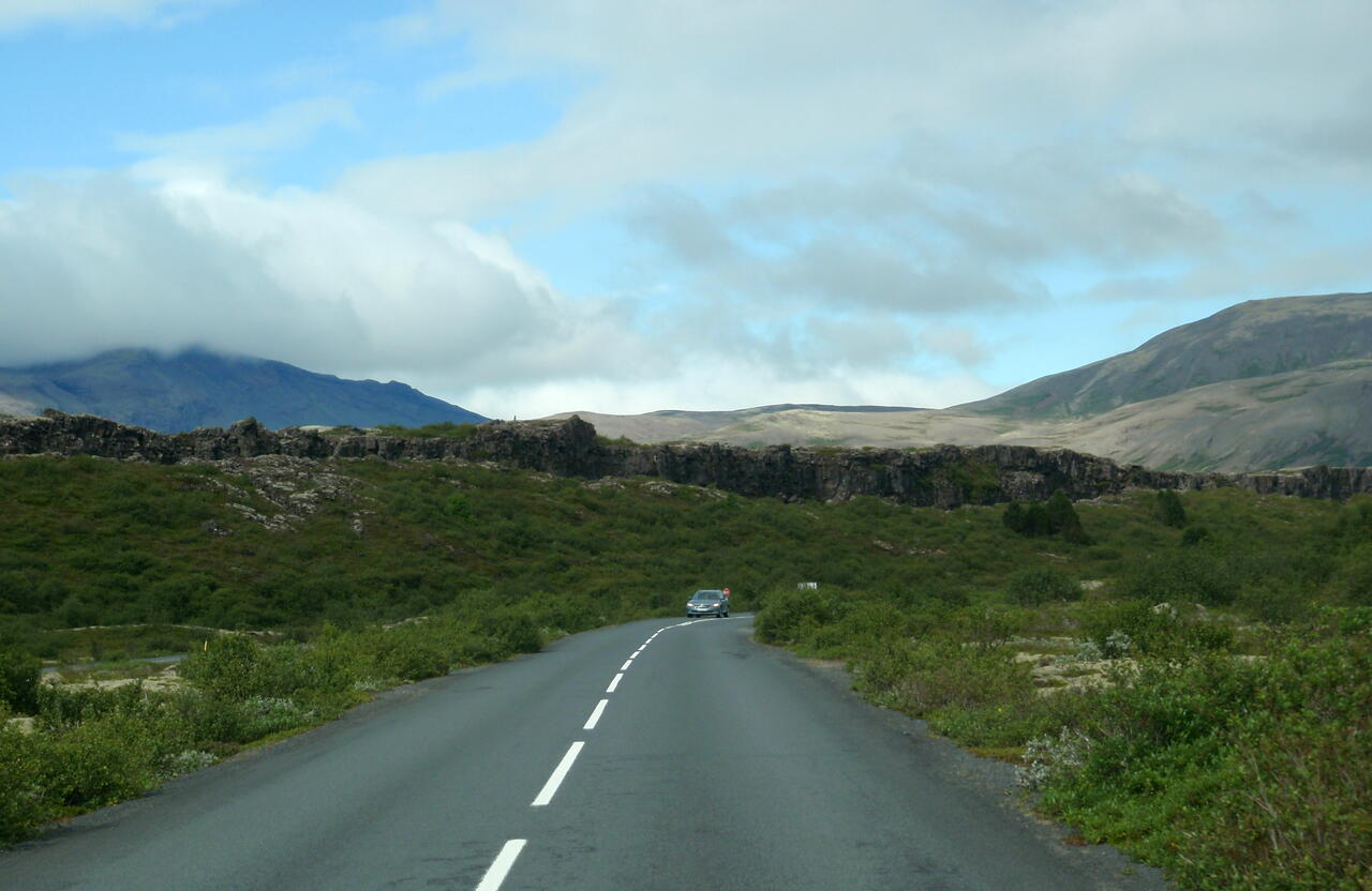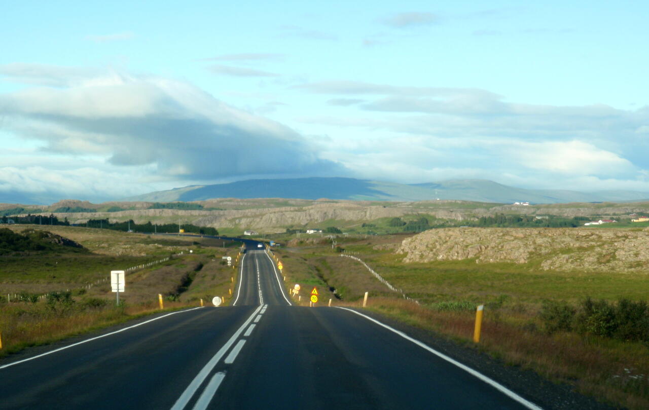 Informationstafel: die dicke schwarze Straße 36 war gesperrt, so mußten wir die dünne Straße 361 nach Þingvellir fahren