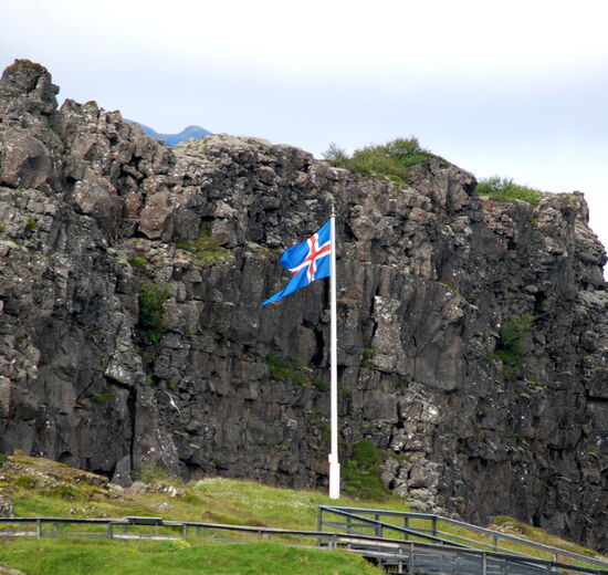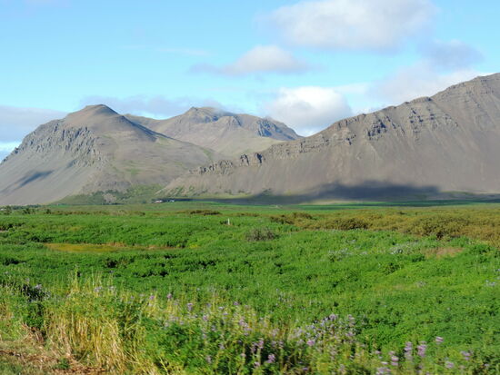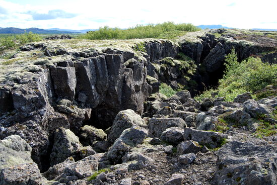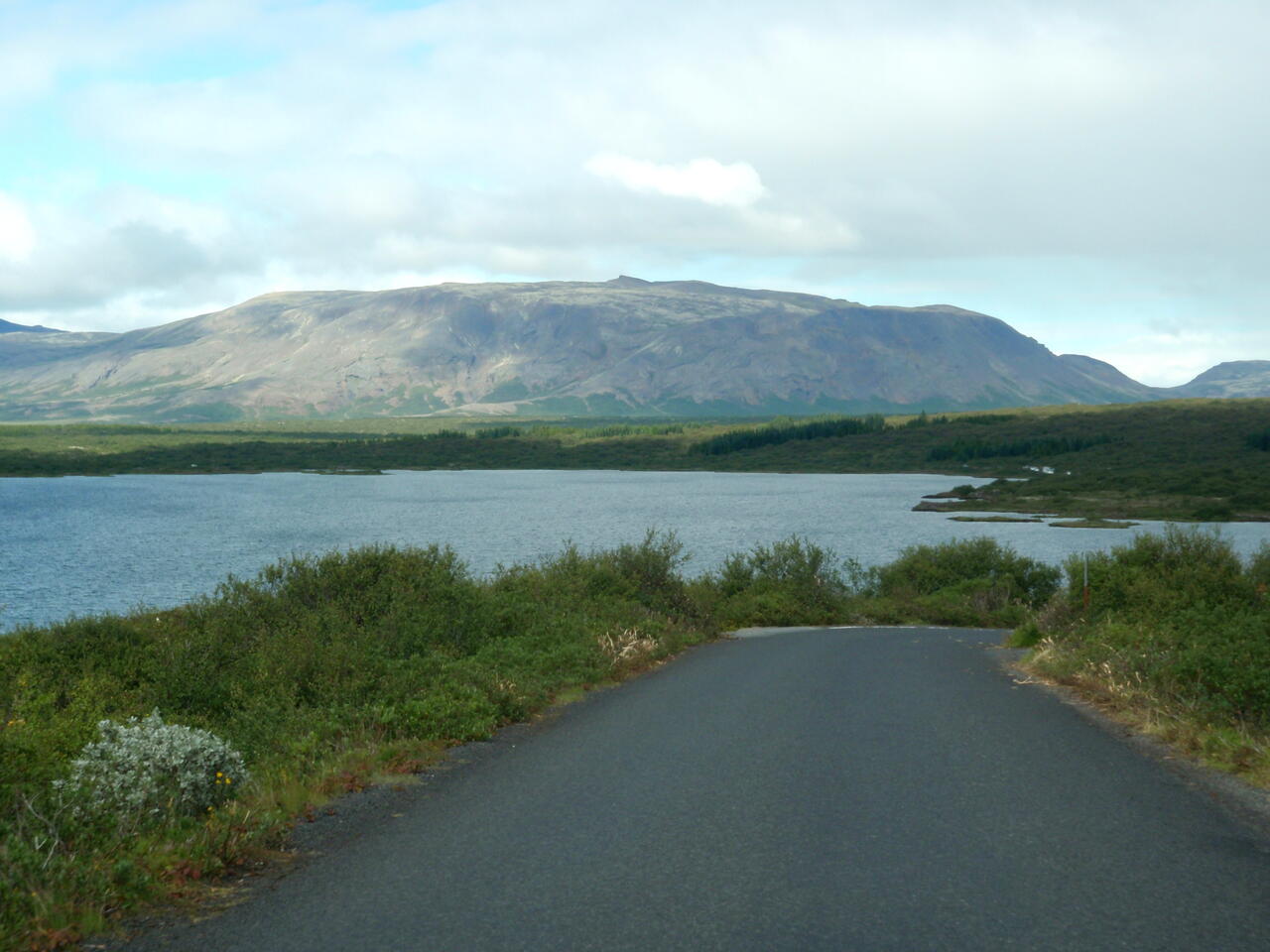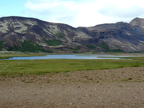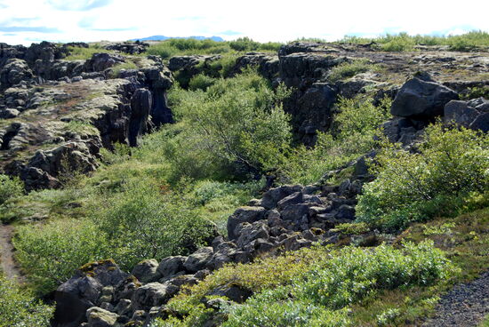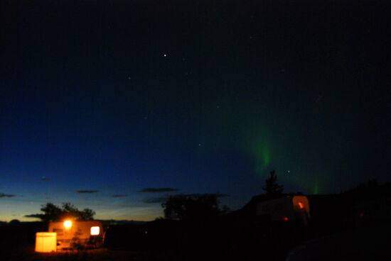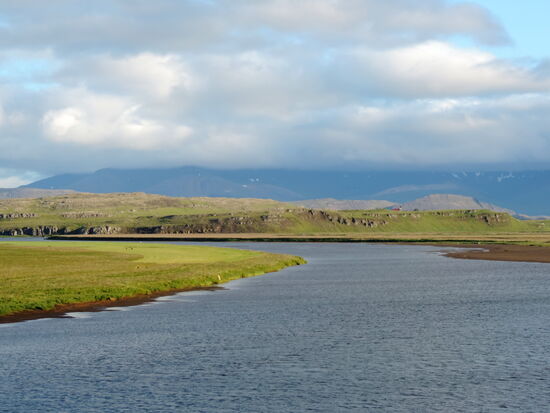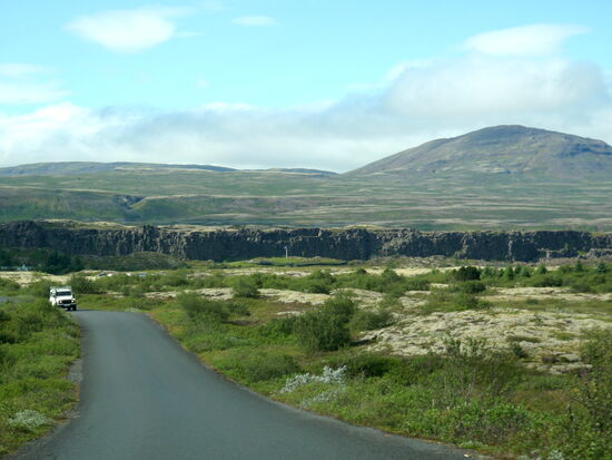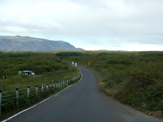 Heute wollten wir in die Gegend fahren, wo wir 2012 das Häuschen gemietet hatten. Der Weg führte über Þingvellir. Zunächst machten wir oberhalb von Laugarvatn einen Halt an einem Parkplatz mit einem tollen Überblick über die Ebene bis hin zur Hekla. Am Ende der Hochfläche kam Þingvallavatn in Sicht, und wieder gab es einen Parkplatz. Am Südufer konnten wir das dampfende geothermische Kraftwerk Nesjavellir sehen, wo wir 2012 vorbeigefahren waren. Die Hauptstraße 36 war wegen Bauarbeiten gesperrt. So wurden wir über die schmale 361 umgeleitet. Sie führte durch das Bruchspaltengebiet. Bald hatten wir die Parkplätze erreicht, die voll mit Touristenautos und Menschenmassen waren. Ein Parkplatz war sogar gesperrt und wurde von Tauchgruppen in Beschlag genommen. In Massen stiegen sie in das Wasser zwischen den Kontinentalplatten. Wir drehten nur eine Runde über einen Parkplatz und machten dabei ein paar Bilder. Einen Stellplatz für unser Gespann gab es nicht. So fuhren wir zum nördlichen Ende des Sees mit dem Zeltplatz und der Information, wo wir Kaffe tranken. Nach der Pause ging es weiter auf der 36. Beim ersten Anstieg konnten wir schön in die Spaltenbildung sehen. Dann ging es auf der Hochfläche weiter. Hier gab es noch einen großen Parkplatz mit Information und gewaltigen Menschenmassen, die wir links liegen ließen. Nach einer Weile ging es wieder bergab zum Meer hin. Hier erreichten wir die Ausläufer von Reykjavík. Wir bogen nach Norden ab und unterquerten den Hvalfjörður im Tunnel. Bald hatten wir Borgarnes erreicht, wo wir noch einkauften und tankten. Nun kamen wir in das Gebiet, wo man viele Basaltbänder sehen konnte. Bald hatten wir die 50 erreicht, wo wir abbogen. Bald darauf kam auch der Abzweig nach Varmaland. Schon von weitem sahen wir einige große Gewächshäuser. Gleich dahinter lag der Campingplats. Am Abend sahen wir noch einmal nach draußen, und es gab wieder Nordlicht. Mehrmals spannte sich ein großer Bogen direkt über unserem Wohnwagen.