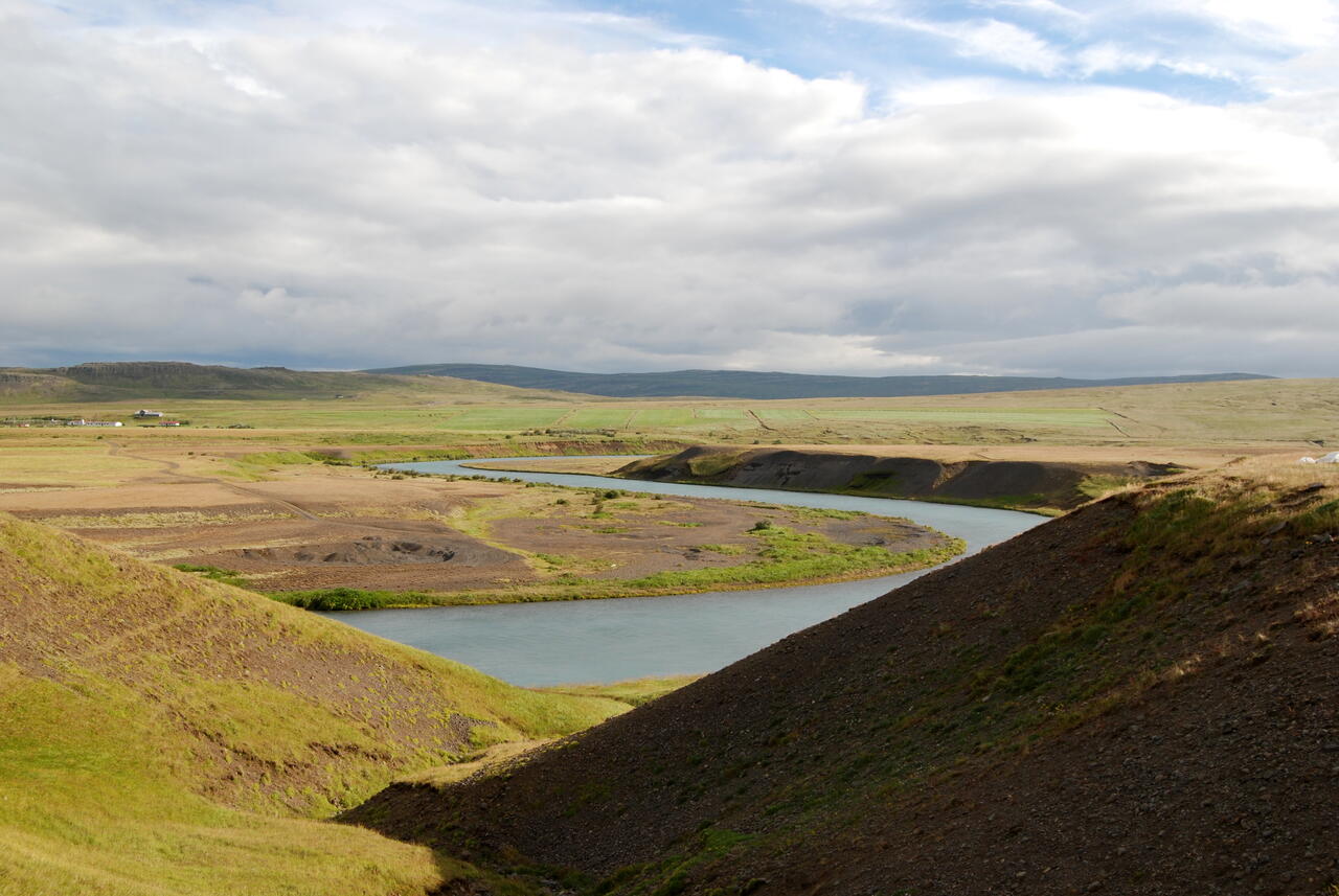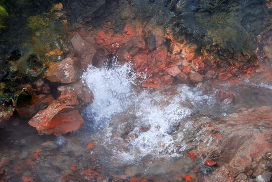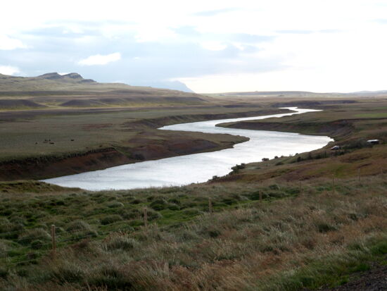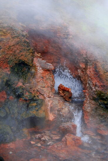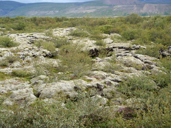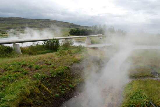Wir wollten heute zu den Wasserfällen Hraunfossar und Barnafoss sowie dem Ort Húsafell fahren. Zuerst ging es aber zu der ergiebigsten Heißwasserquelle der Welt, Deiltartunguhver. Sie versorgt die ganze Gegend mit heißem Wasser und Fernwärme. Als wir 2012 dort waren, konnte man noch direkt an sie heran gehen. Nun trennt ein massiver Zaun alles ab. Schöne Fotos sind dadurch kaum noch möglich. Außerdem blies uns heute der Wind die Dampfschwaden direkt entgegen.