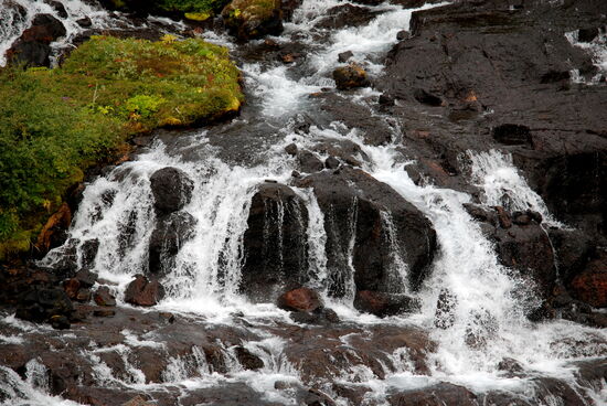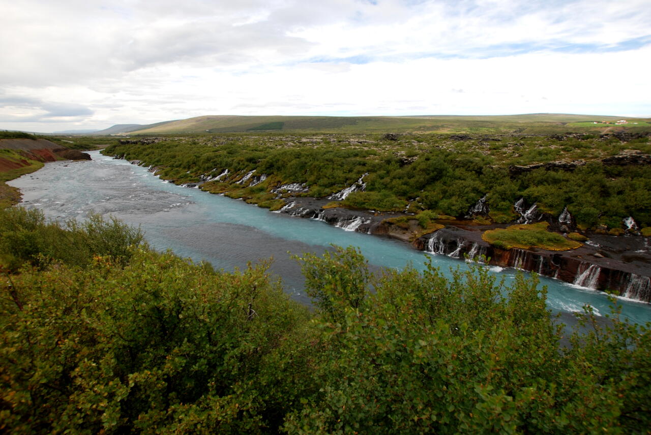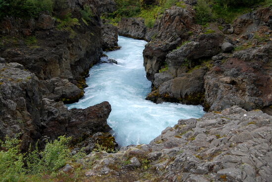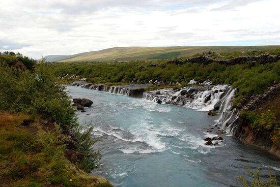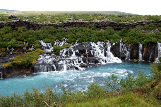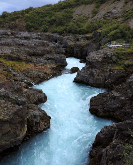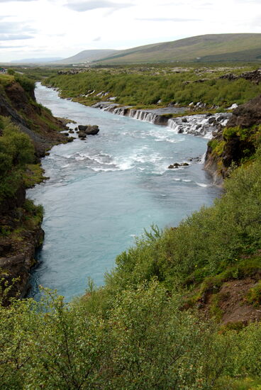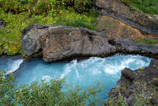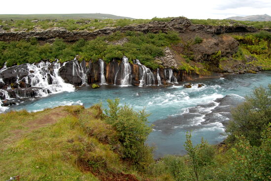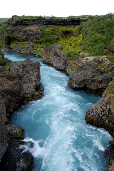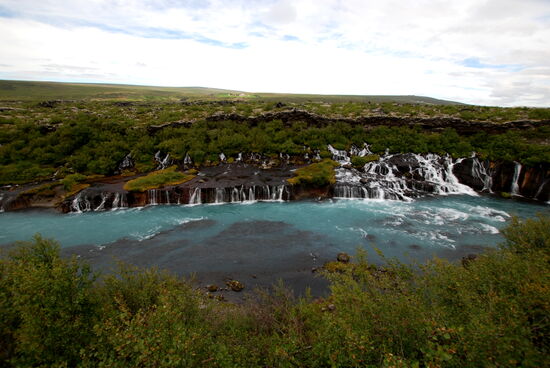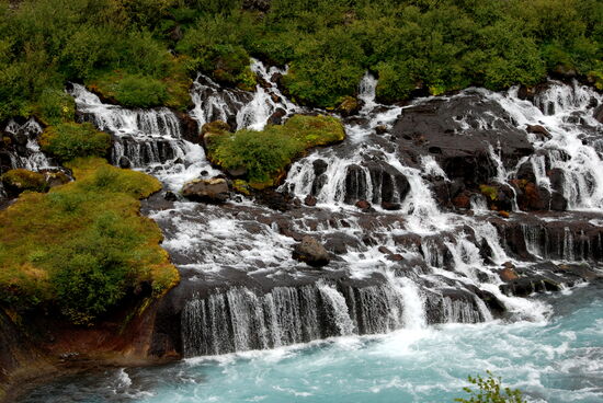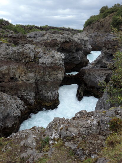Weiter ging die Fahrt nun zu den Wasserfällen. Wir bekamen noch einen Parkplatz und reihten uns dann in den Massenstrom ein. Hraunfossar sind eine ganze Reihe kleiner Wasserfälle, die, wie der Name sagt, unter der Lava hervorquellen. Im hinteren Flußteil hat sich der Strom durch die Felsen gefressen, hat Höhlungen, Gletschertöpfe und sogar eine Naturbrücke geschaffen. Dies ist der Barnafoss, Wasserfall der Kinder. Zwei Kinder sind hier vor langer Zeit von einem Steinbogen abgestürzt. Die Fälle sind wunderschön, und die Urgewalt, mit der der Strom hier dahinrauscht, fasziniert.