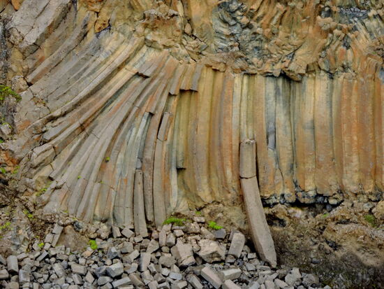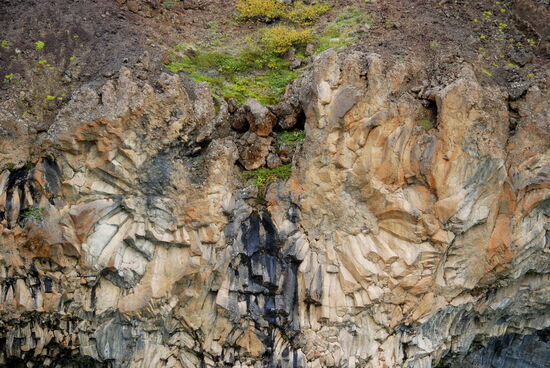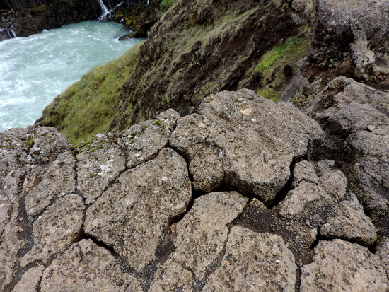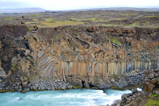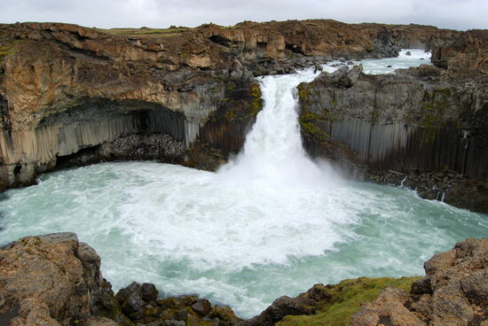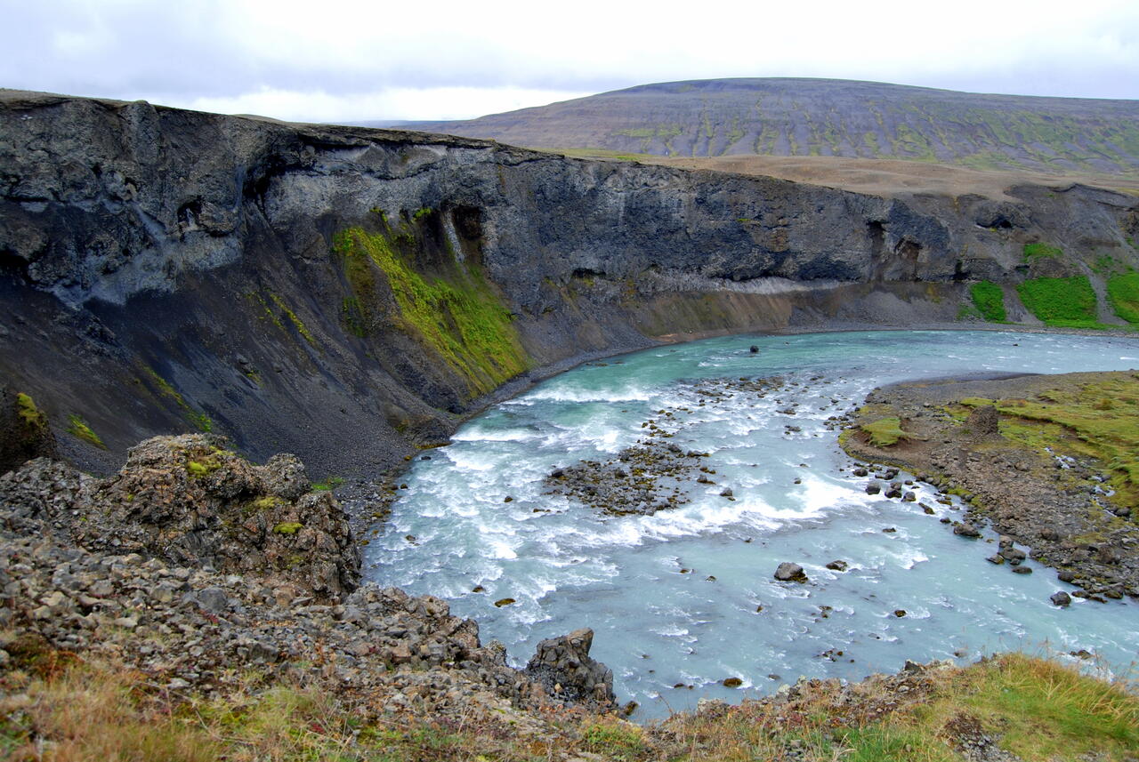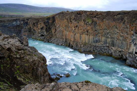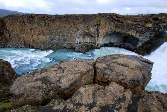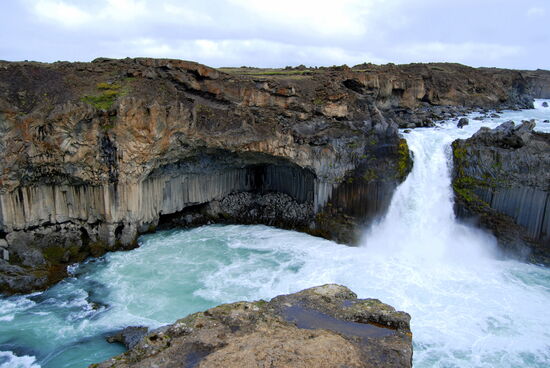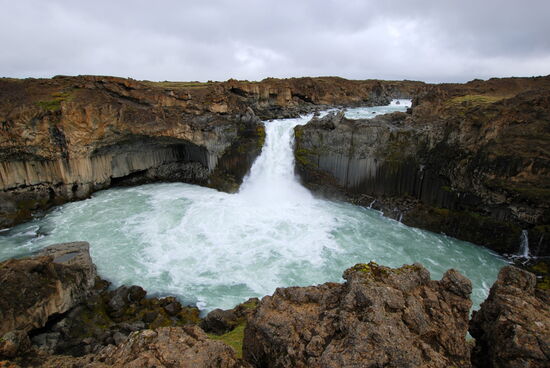 Wir ließen uns nicht abhalten, packten die restlichen Sachen und fuhren zuerst zum Goðafoss. Dort begann der Grusväg 844 in Richtung Hochland. Er ließ sich sehr gut befahren, und wir kamen flott voran. Nach 22 km tauchte die Brücke auf, über die wir zur 842 auf der anderen Seite des Flusses wechselten. Wir wollten uns den Aldeyjarfoss ansehen, der am beeindruckensten von der Südseite zu sehen ist. Beim Übergang von der 842 in die F 26, der Sprengisandurpiste, führte ein kleiner Stichweg zum Parkplatz. Ein Pfad führte in Serpentinen hinunter auf das Plateau, wo man den Wasserfall in voller Schönheit bewundern konnte. Schon auf dem Weg beeindruckten die Basaltsäulen des Tals. Sie leuchteten in unterschiedlichen, aber meist rötlich-bräunlichen Tönen und bildeten verschiedene Figuren. Der Aldeyjarfoss stürzt in einen großen Kessel, und es sind auch einige Höhlen ausgespült. Am Rand des Plateaus mußte man vorsichtig sein. Es hatten sich schon einige Basaltsäulen gelöst, und man konnte in den Spalten nach unten sehen. Wir konnten das alles bei trockenem Wetter bestaunen, aber im Tal schoben sich uns Wolken entgegen. Auf dem Rückweg zur Brücke sahen wir einen Regenbogen, dann fing es an leicht zu regnen. Wir wechselten an der Brücke wieder auf die andere Seite und fuhren die erste Straße weiter nach Süden, die dann 843 hieß. Schließlich kamen wir an den großen See Svartárvatn. Hier lag noch ein großer Hof, dann begann die Jeeppiste ohne Nummer.