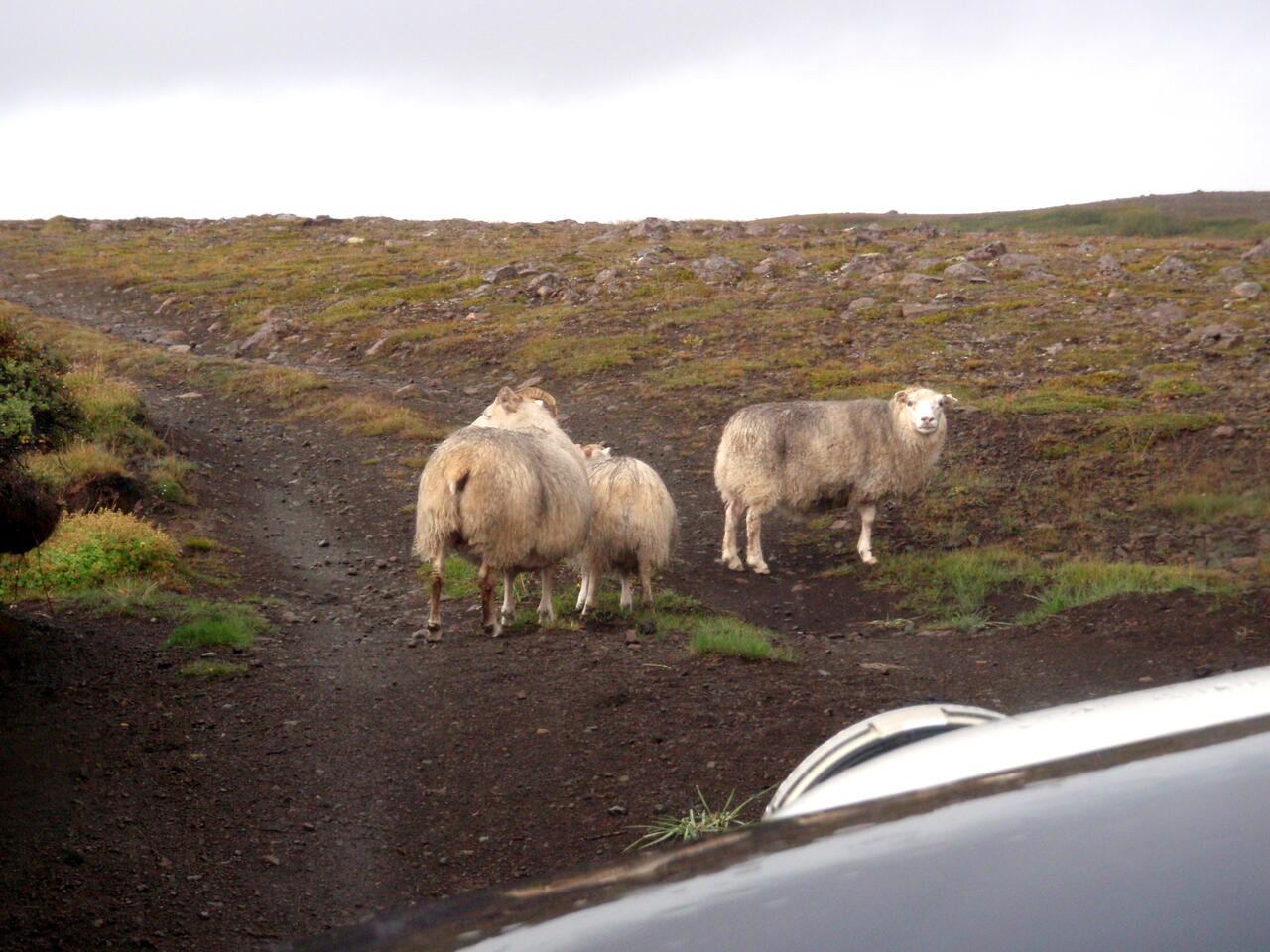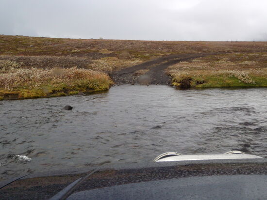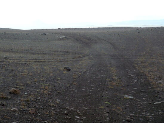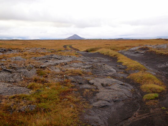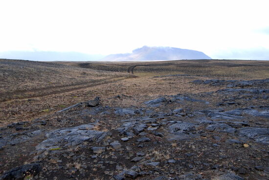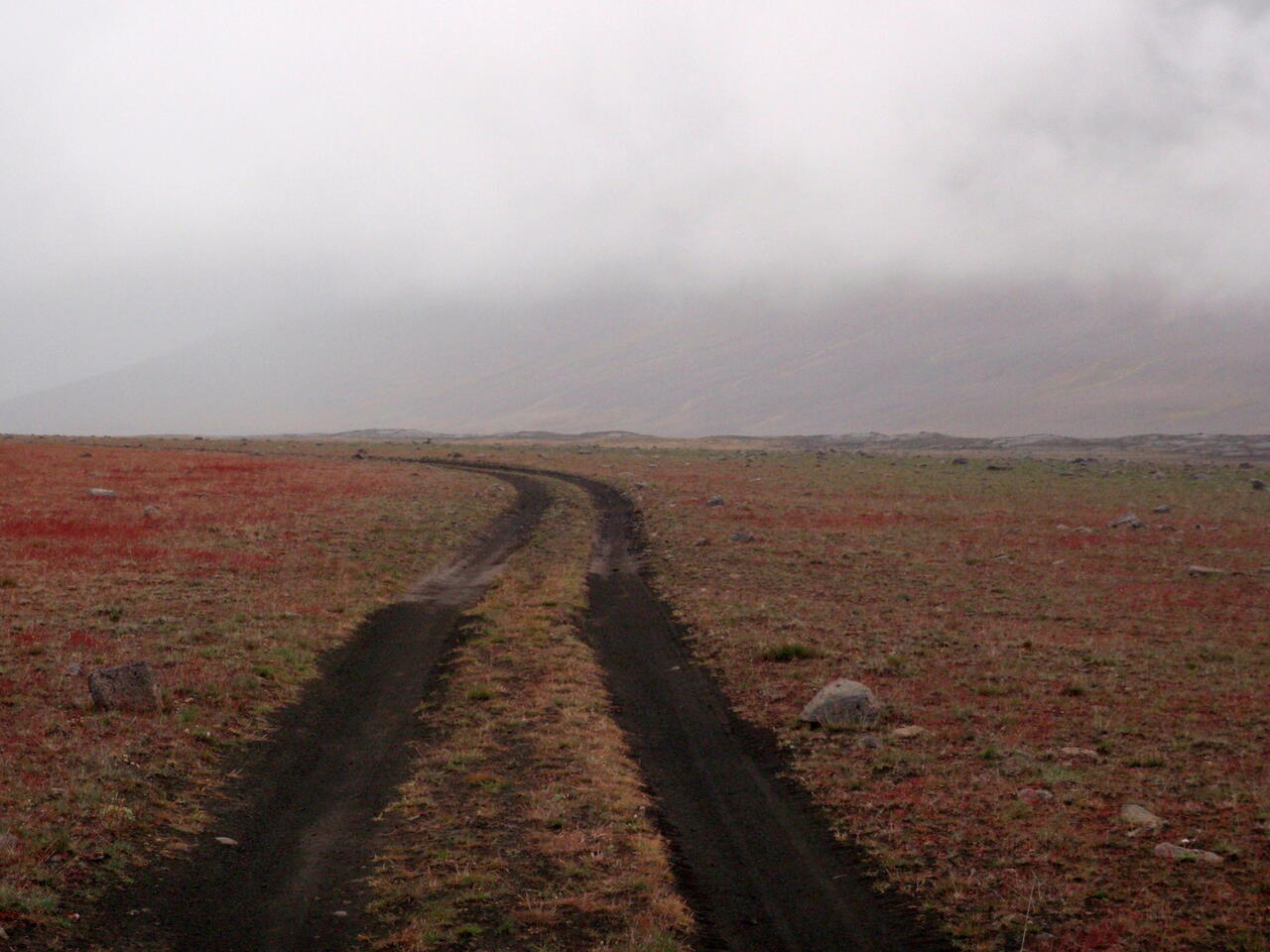 Erst fuhren wir durch niedriges Weiden- und Birkenbuschwerk. Wir stellten fest, daß die Herbstfärbung schon begann! Lange Zeit fuhren wir an einem Fluß entlang. Der Weg wurde immer mehr ausgefahren. Unser Pajero hat leider nicht die große Bodenfreiheit, die die umgebauten isländischen Fahrzeuge mit ihren riesigen Rädern haben. Wir kamen nur langsam und vorsichtig voran. Schließlich war die weitere Piste in Richtung Süden gesperrt, und wir wurden auf eine Umleitung in Richtung Nordosten hingewiesen. Dieser Weg war nicht besser. An einem Lavafeld war ein Abzweig, wo die Umleitung zu Ende war. Der Weg zur Askja führte durch das größte Lavafeld Íslands, Ódáðahraun. Schon hier am Anfang führte die Piste direkt über die ruppige Plattenlava, nur mit gelben Pfählen markiert. Eine richtige Piste war nicht geschoben, soweit wir das mit dem Fernglas beurteilen konnten. So beschlossen wir, unser ursprüngliches Vorhaben abzubrechen und den anderen Weg weiter in Richtung Mývatn zu nehmen. Er war jetzt besser zu befahren, hatte aber auch einige ausgefahrene oder ruppige Stellen, wenn es über Lava- und Geröllfelder ging. Wir fuhren auf den Berg Sellandafjall zu, als eine kleine Vadställe auftauchte. Dann ging es weiter auf der Westseite des Berges an interessanten Lavaformationen vorbei, aber auch durch spärlich mit Gras bewachsene ebene Sand- und Geröllflächen. Auffällig waren rote Sauerampferfelder. Teilweise war der Weg schwer zu erkennen, da es oft viele verschiedene Fahrspuren durch die Geröllebene gab. Nun regnete es auch immer wieder, und die Berge waren wolkenverhangen.