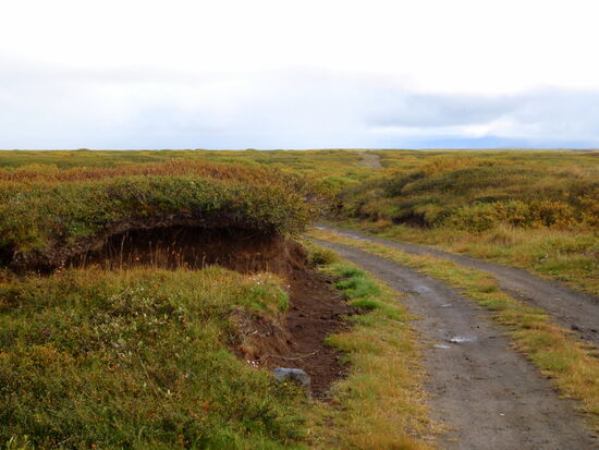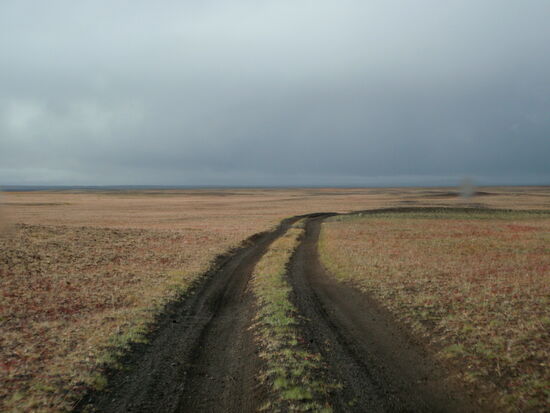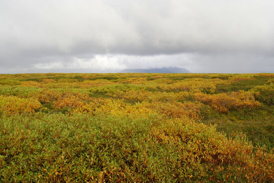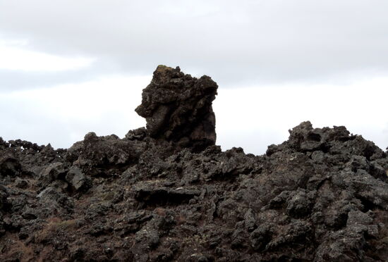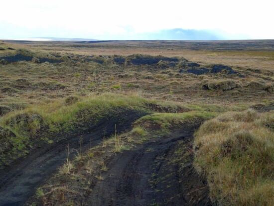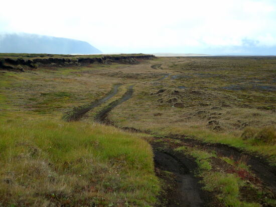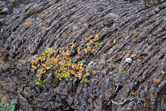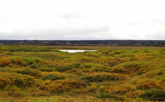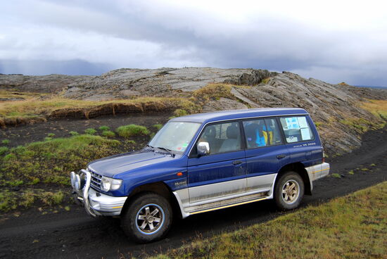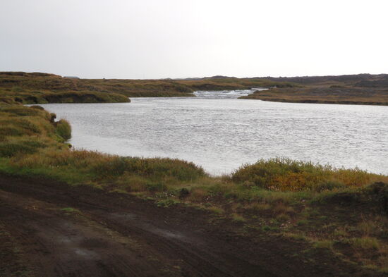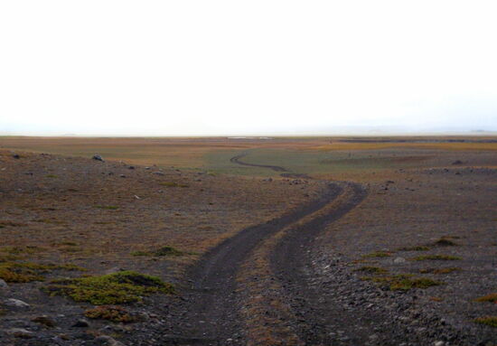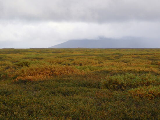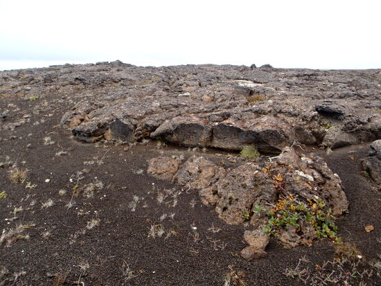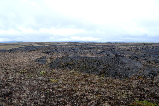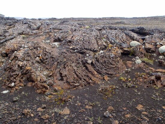Erst fuhren wir durch niedriges Weiden- und Birkenbuschwerk. Wir stellten fest, daß die Herbstfärbung schon begann! Lange Zeit fuhren wir an einem Fluß entlang. Der Weg wurde immer mehr ausgefahren. Unser Pajero hat leider nicht die große Bodenfreiheit, die die umgebauten isländischen Fahrzeuge mit ihren riesigen Rädern haben. Wir kamen nur langsam und vorsichtig voran. Schließlich war die weitere Piste in Richtung Süden gesperrt, und wir wurden auf eine Umleitung in Richtung Nordosten hingewiesen. Dieser Weg war nicht besser. An einem Lavafeld war ein Abzweig, wo die Umleitung zu Ende war. Der Weg zur Askja führte durch das größte Lavafeld Íslands, Ódáðahraun. Schon hier am Anfang führte die Piste direkt über die ruppige Plattenlava, nur mit gelben Pfählen markiert. Eine richtige Piste war nicht geschoben, soweit wir das mit dem Fernglas beurteilen konnten. So beschlossen wir, unser ursprüngliches Vorhaben abzubrechen und den anderen Weg weiter in Richtung Mývatn zu nehmen. Er war jetzt besser zu befahren, hatte aber auch einige ausgefahrene oder ruppige Stellen, wenn es über Lava- und Geröllfelder ging. Wir fuhren auf den Berg Sellandafjall zu, als eine kleine Vadställe auftauchte. Dann ging es weiter auf der Westseite des Berges an interessanten Lavaformationen vorbei, aber auch durch spärlich mit Gras bewachsene ebene Sand- und Geröllflächen. Auffällig waren rote Sauerampferfelder. Teilweise war der Weg schwer zu erkennen, da es oft viele verschiedene Fahrspuren durch die Geröllebene gab. Nun regnete es auch immer wieder, und die Berge waren wolkenverhangen.