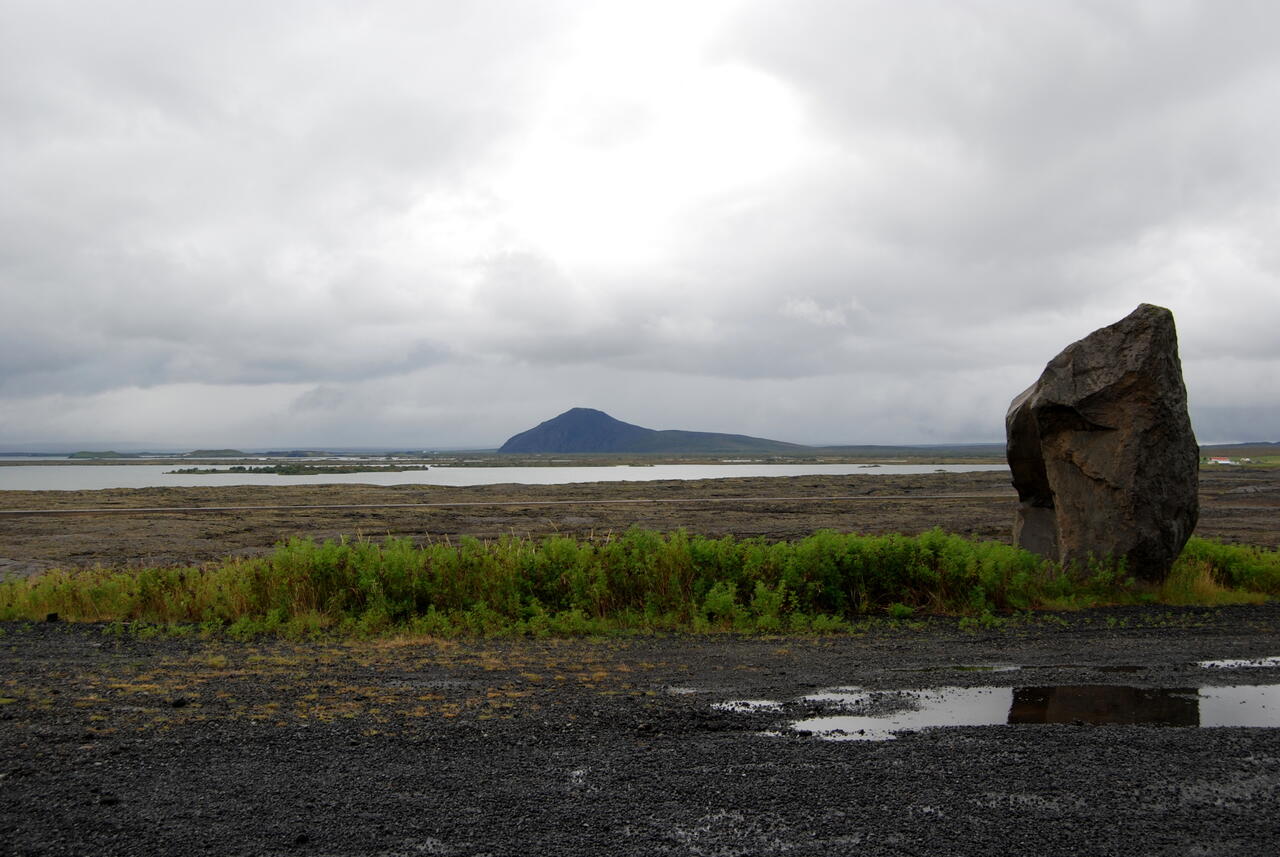Heute fuhren wir im strömenden Regen zum Mývatn. Die Wolken hingen tief. Über die 848 fuhren wir um den Mývatn herum nach Reykjahlíð und gingen zuerst in die Information. Hier gab es eine interessante Ausstellung über Ísland und seine Geologie. Wir hatten gestern in der Campinginfo einen Prospekt gefunden von Mýflug, dem Anbieter von Rundflügen. Als wir nun heute die Preise erfuhren, wurde es für uns richtig interessant. Wir hatten schon früher eine Broschüre über Flüge mit einem Hubschrauber von Möðrudalur zur Askja gelesen. Wir liebäugelten damit, aber die Preise waren doch recht hoch. So fuhren wir zum Flugplatz und erkundigten uns genauer. Der Pilot sprach etwas dänisch, so konnten wir uns gut verständigen. Nun mußten wir auf besseres Wetter warten. Der Campingplats gleich hinter dem Flugfeld war erstaunlich preiswert. Später kamen wir zu der Vermutung, daß man uns als Ísländer angesehen hatte, als wir uns auf schwedisch anmeldeten. In den Camping-Rezeptionen arbeiteten fast nur noch Leute aus aller Herren Länder, kaum noch Einheimische.