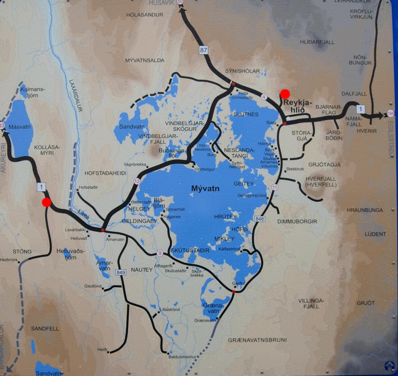 wir standen links am roten Punkt und fuhren dann die schmale Straße 848 im Süden und Osten um den Mývatn herum nach Reykjahlið, roter Punkt oben