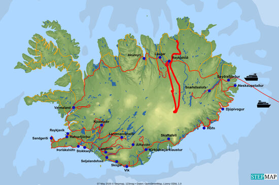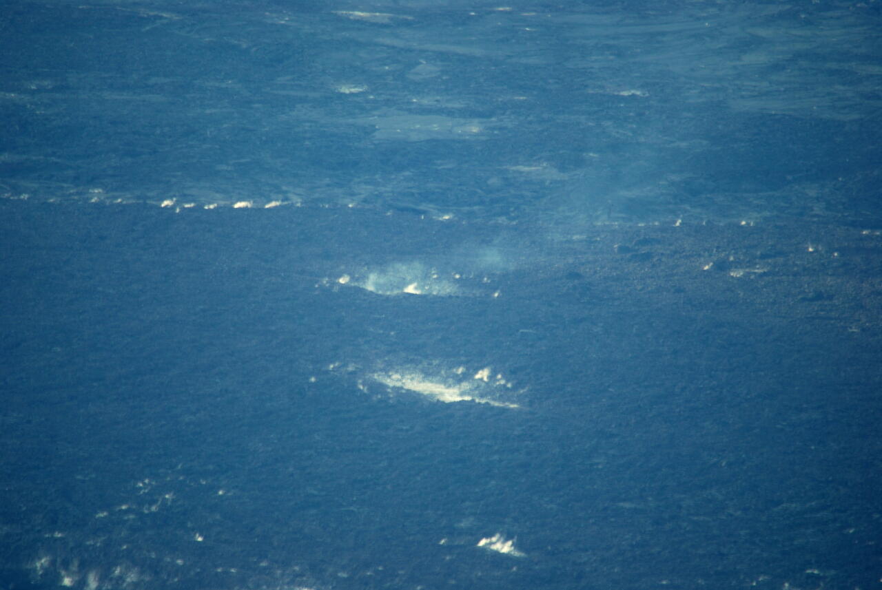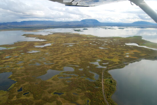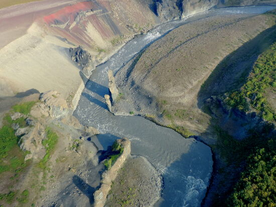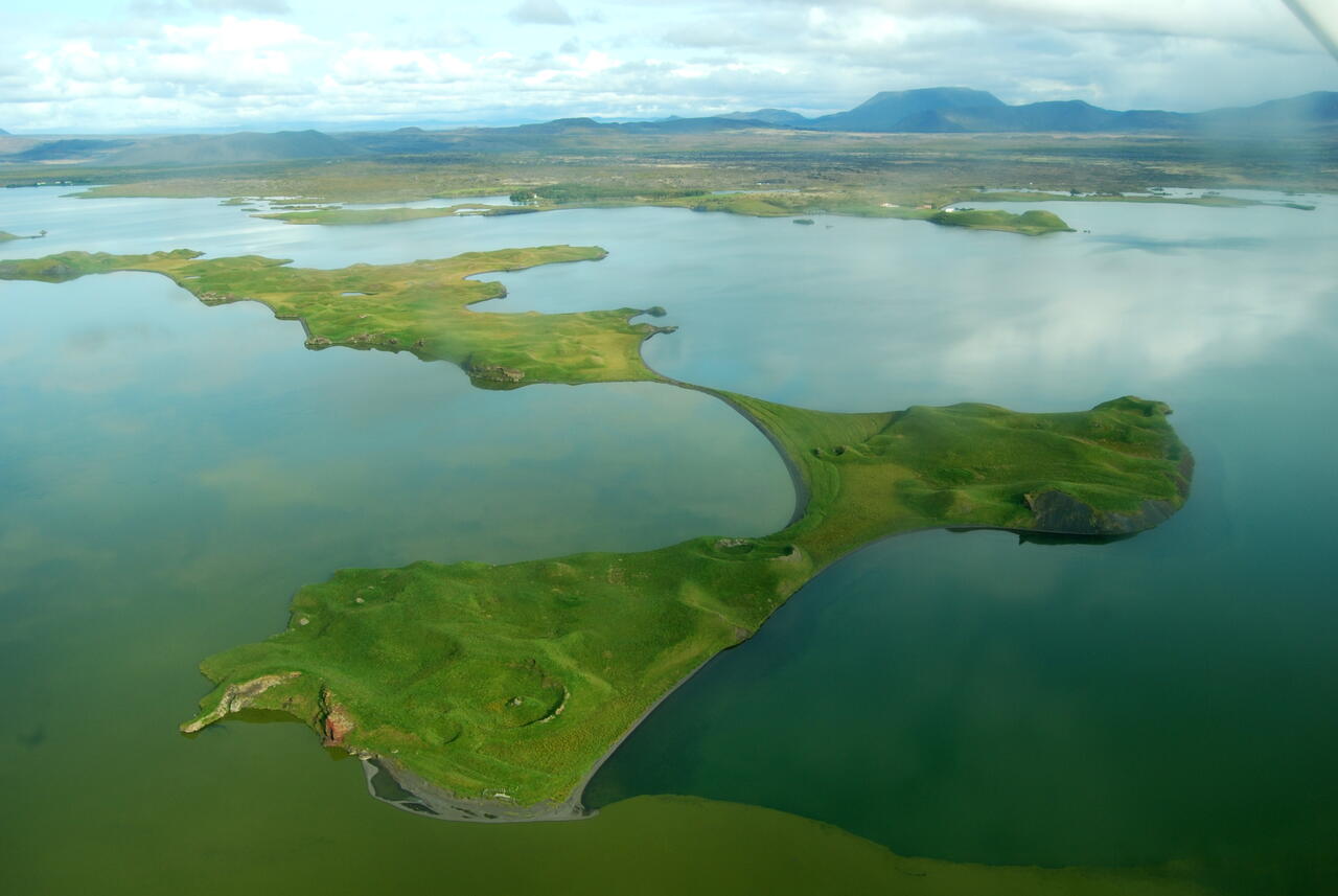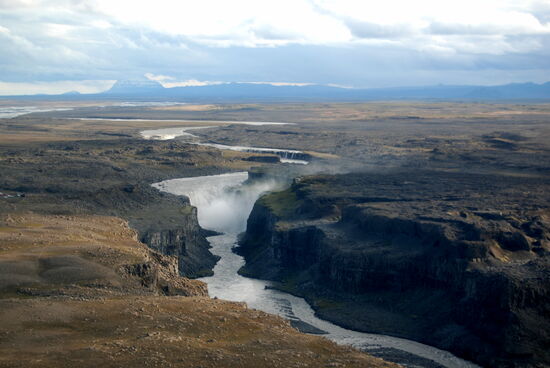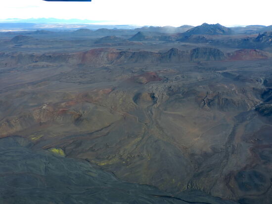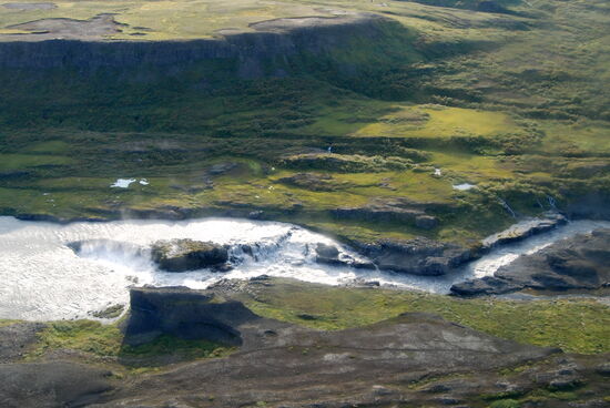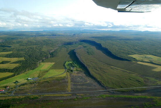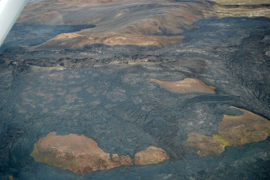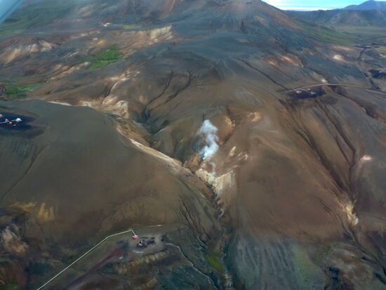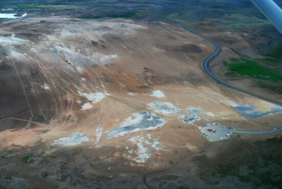 Unser Flug führte nun wieder nach Norden. Es sah beeindruckend aus, wie die neue Lava die Flüsse verdrängt hatten. Nun flogen wir dichter an der Herðubreið vorbei zurück zum Mývatn. Die schönen Lavaformationen von Dimmuborgir waren aus der Vogelperspektive nur schwer zu erkennen, wirkten viel flacher. Über den Krater Hverfjall flogen wir fast direkt, dann weiter über die Verwerfungszone Grjótagjá mit den wassergefüllten Höhlen und schwenkten zum Sulfatarengebiet Námafjall Hverir ein. Dann ging es wieder Richtung Norden über das Kraftwerk, den Krater Víti und Leirhnjúkur. Beeindruckend waren die unterschiedlichen Färbungen der verschiedenalten Lavafelder. Wir schwenkten nach Osten ab zum Selfoss und Dettifoss. Dann flogen wir in weiten Schleifen über die Wasserfälle und weiter flußabwärts über den Hafragilsfoss. Über dem Tal der Jökulsá á Fjöllum flogen wir in Richtung Norden. Unterwegs sahen wir einige Felsformationen, die wir von früheren Fahrten kannten, wie z.B. Karl og Kerling. Bald öffnete sich das Delta des Flusses. Hier lag Ásbyrgi, eine Felsformation, die der Sage nach durch den Hufabdruck von Odins Pferd Sleipnir entstanden ist. Auf dem Campingplats dort, den wir deutlich sehen konnten, hatten wir 2016 übernachtet. Wir flogen zurück und schwenkten über dem Selfoss in Richtung Westen und anschließend wieder nach Süden. Wir sahen noch einmal Leirhnjúkur, das Kraftwerk und das Sulfatarengebiet Námafjall Hverir. Dann lag unter uns das Bad, und wir flogen einen weiten Bogen, daß wir von Süden über den Ort Reykjahlíð zurück zum Flugfeld flogen. Der Campingplats mit unserem Wohnwagen huschte vorbei, und dann hatten wir schon aufgesetzt.