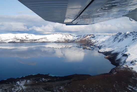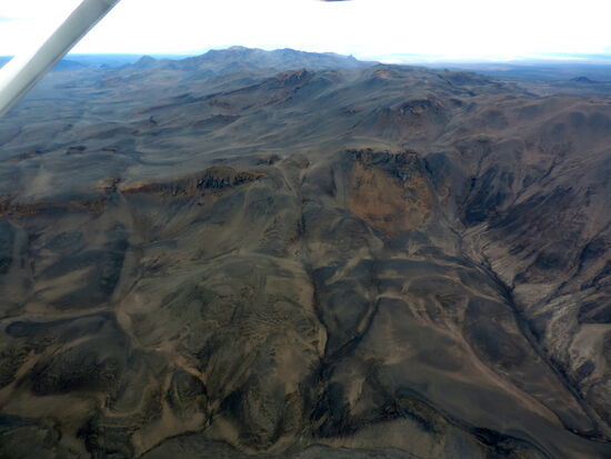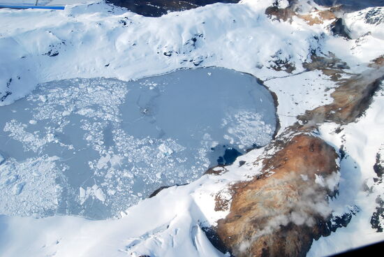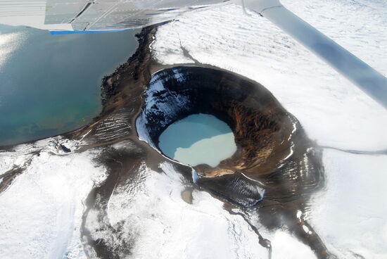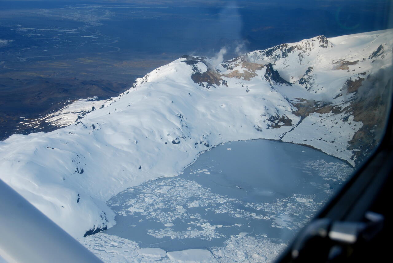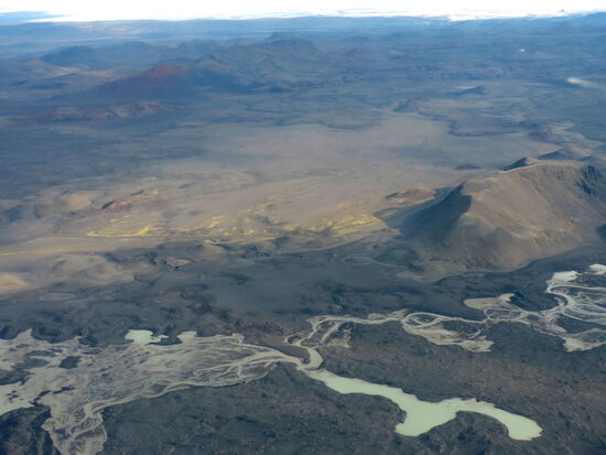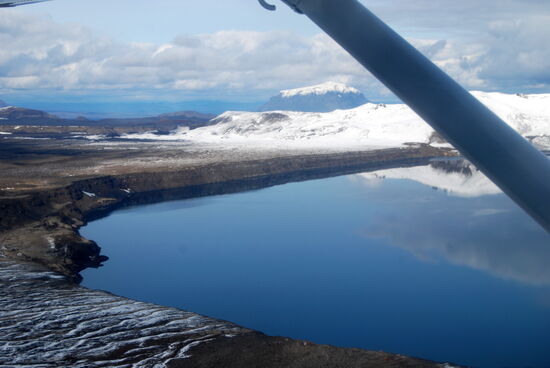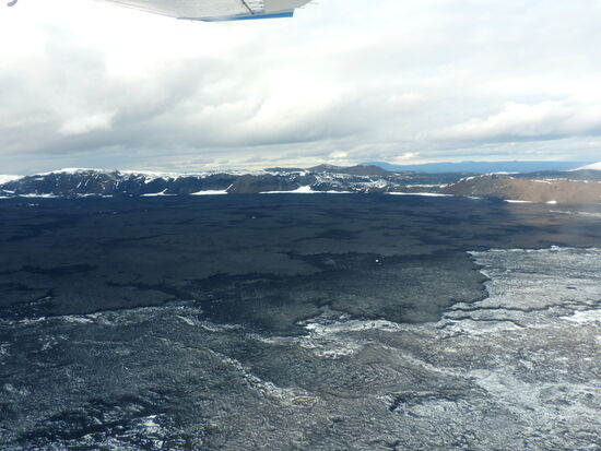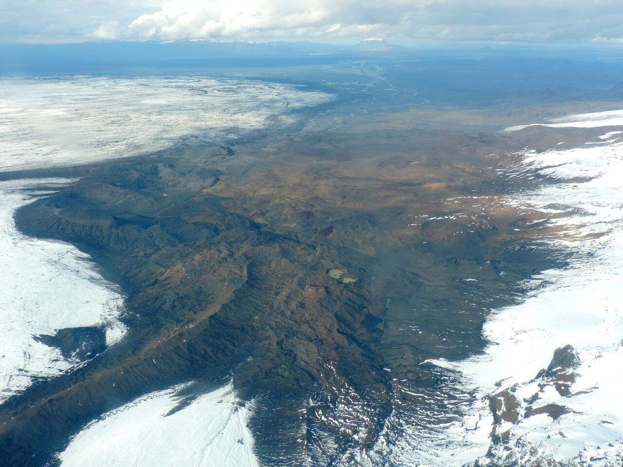 So kletterten wir in die kleine Cessna TF-MYY, die auf dem Flugfeld stand. Wir huschten so schnell über den Campingplats, der direkt unterhalb der Startbahn lag, daß wir es nicht schafften, unseren Wowa „einzufangen“. Aber die Ortschaft Reykjahlíð mit den Lavafeldern und der Kirche konnten wir schön betrachten. Dann schwenkte die Maschine über den See und flog am Westufer entlang. Am Südufer flogen wir eine große Schleife über die Pseudokrater. Dann ging es direkt nach Süden über das größte Lavafeld Íslands, Ódáðahraun. Hier waren wir vor vier Tagen entlang gefahren. In der Ferne sahen wir die schneebedeckte Herðubreið vorbeigleiten, dann sahen wir vor uns die weiße Wand der Askja. Vor 2 Jahren waren wir hier über die schwarze und rote Bimsebene zum Víti gewandert, nun lag hier Schnee. Über den Kratersee der Askja, Öskjuvatn, flogen wir einige Schleifen. Dann schwenkten wir wieder nach Süden ab und flogen über das neue Lavafeld der Ausbrüche des Bárðarbunga von 2014, nýja-Holuhraun. An vielen Stellen dampfte es noch, und der Pilot wies uns auf den Hauptkrater des Ausbruchs hin. Es war das größte Lavafeld von 1,4 km³ seit der Laki-Ausbrüche von 1783-84. Wir flogen über den Ausläufer des Vatnajökull. Die schwarz-weiße Musterung durch Asche und Schnee war beeindruckend! Dann sahen wir auch schon die Station von Kverkfjöll, Sigurðarskáli. Hier hatten wir 2016 übernachtet. In mehreren Schleifen flogen wir oberhalb über den Gletscher und die heiße Quelle, schier endlose weiße Flächen, dann wieder Einbrüche oder Abbrüche mit großen Eisblöcken. Wir verließen den Gletscher über das Tal, in dem wir 2016 gewandert waren. Zu der Zeit war die Brücke zur Gletscherhöhle weggerissen worden. Jetzt konnten wir sehen, daß der Bach inzwischen verrohrt war.