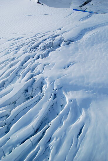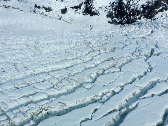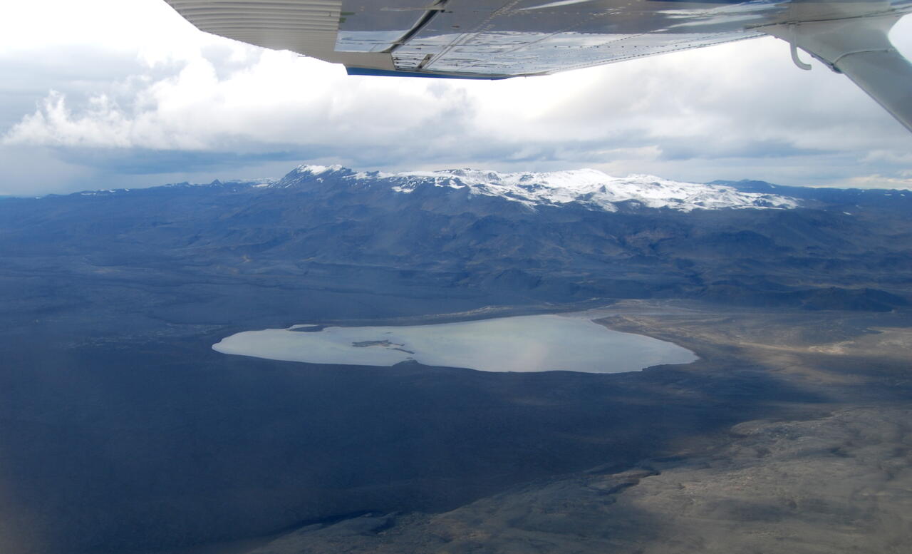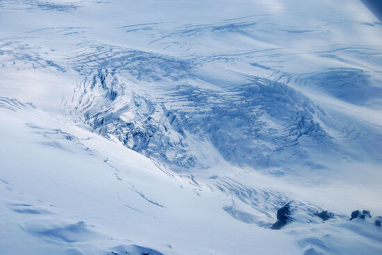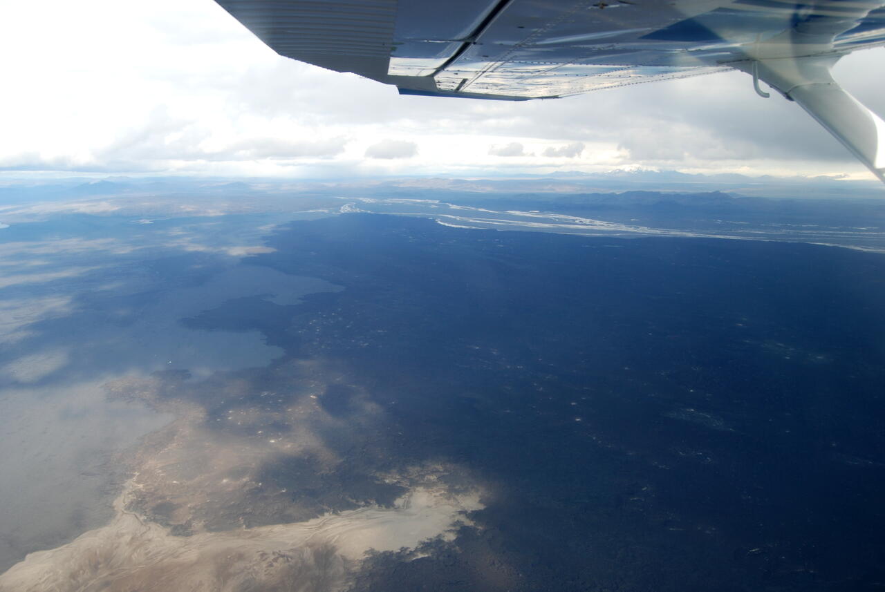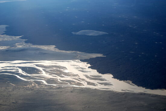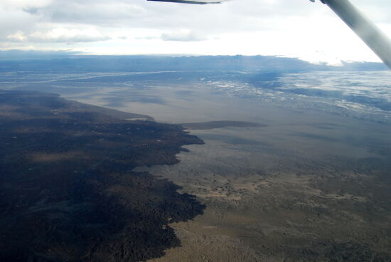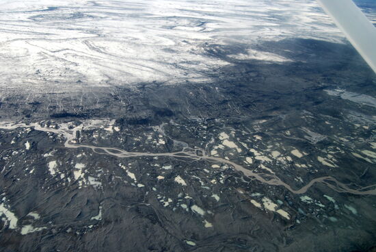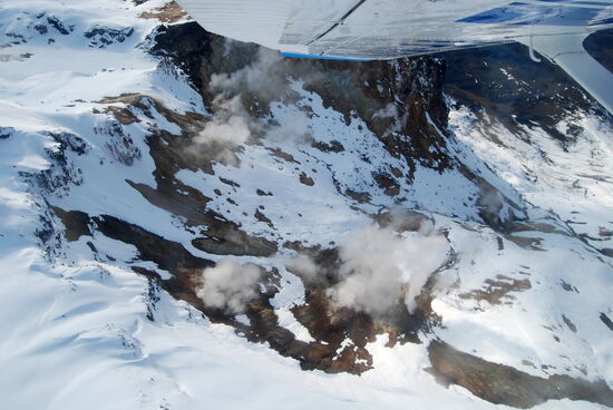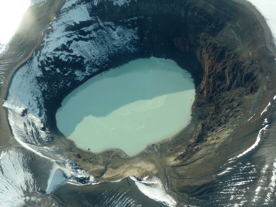 So kletterten wir in die kleine Cessna TF-MYY, die auf dem Flugfeld stand. Wir huschten so schnell über den Campingplats, der direkt unterhalb der Startbahn lag, daß wir es nicht schafften, unseren Wowa „einzufangen“. Aber die Ortschaft Reykjahlíð mit den Lavafeldern und der Kirche konnten wir schön betrachten. Dann schwenkte die Maschine über den See und flog am Westufer entlang. Am Südufer flogen wir eine große Schleife über die Pseudokrater. Dann ging es direkt nach Süden über das größte Lavafeld Íslands, Ódáðahraun. Hier waren wir vor vier Tagen entlang gefahren. In der Ferne sahen wir die schneebedeckte Herðubreið vorbeigleiten, dann sahen wir vor uns die weiße Wand der Askja. Vor 2 Jahren waren wir hier über die schwarze und rote Bimsebene zum Víti gewandert, nun lag hier Schnee. Über den Kratersee der Askja, Öskjuvatn, flogen wir einige Schleifen. Dann schwenkten wir wieder nach Süden ab und flogen über das neue Lavafeld der Ausbrüche des Bárðarbunga von 2014, nýja-Holuhraun. An vielen Stellen dampfte es noch, und der Pilot wies uns auf den Hauptkrater des Ausbruchs hin. Es war das größte Lavafeld von 1,4 km³ seit der Laki-Ausbrüche von 1783-84. Wir flogen über den Ausläufer des Vatnajökull. Die schwarz-weiße Musterung durch Asche und Schnee war beeindruckend! Dann sahen wir auch schon die Station von Kverkfjöll, Sigurðarskáli. Hier hatten wir 2016 übernachtet. In mehreren Schleifen flogen wir oberhalb über den Gletscher und die heiße Quelle, schier endlose weiße Flächen, dann wieder Einbrüche oder Abbrüche mit großen Eisblöcken. Wir verließen den Gletscher über das Tal, in dem wir 2016 gewandert waren. Zu der Zeit war die Brücke zur Gletscherhöhle weggerissen worden. Jetzt konnten wir sehen, daß der Bach inzwischen verrohrt war.