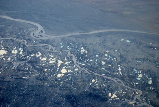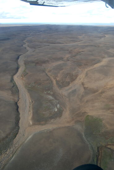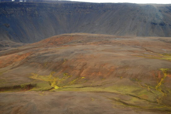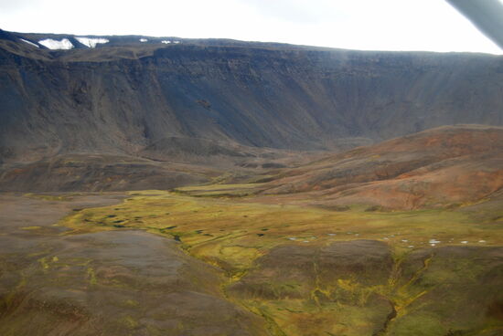 wir flogen noch einmal über Sigurðarskáli, links von der Hütte die Grasstreifen, wo wir 2016 unser Zelt aufgebaut hatten