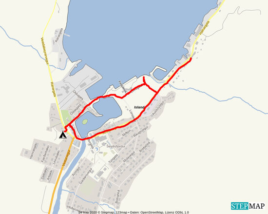 die Norðurgata von Süden, auf dem Grünstreifen links stand 2016 noch ein Wegweiser mit einem GPS-Versteck