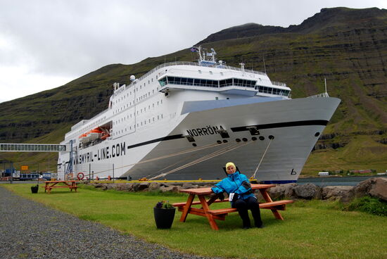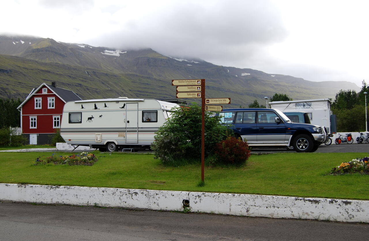 Wir gingen zurück Richtung Campingplats, diesmal auf der anderen Seite des Sees Lónið. Es gab immer wieder schöne Ausblicke auf die malerischen kleinen Häuser. Durch die kleine Straße Norðurgata, deren Pflaster in Regenbogenfarben angemalt ist, gingen wir zurück auf die Kirche zu. So waren wir bald wieder am Wohnwagen. Es waren noch zwei Stunden Zeit, bis wir zur Fähre vorfahren mußten. So konnten wir alles in Ruhe für die Fährfahrt vorbereiten.