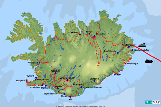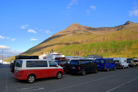 Eine Nacht hatten wir noch, aber leider mußten wir sehr früh aufstehen. Die Fähre sollte um 10 Uhr Ortszeit ankommen, das entsprach 8 Uhr isländischer Zeit. Ehe wir aber an unser Auto kamen, mußten wir noch eine ganze Weile warten. Zuerst mußte das untere Deck geräumt werden, damit die Abfahrt von der Rampe möglich wurde. Da wir ja in der Ecke neben der Rampe standen, mußte auch unser Deck erst weitgehend geräumt werden, damit wir Platz zum Rangieren hatten. So konnten wir uns die Parade der Fahrzeuge an der Rampe ansehen, bis wir dann endlich auch hinabfahren und die Fähre verlassen konnten.