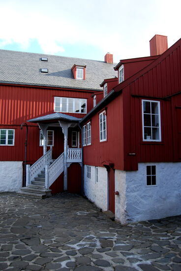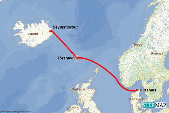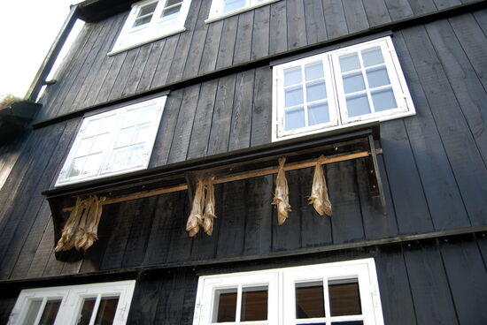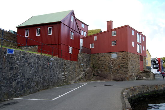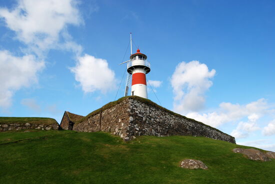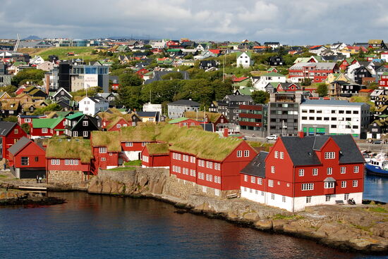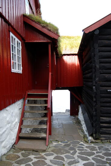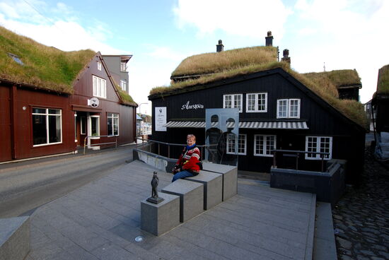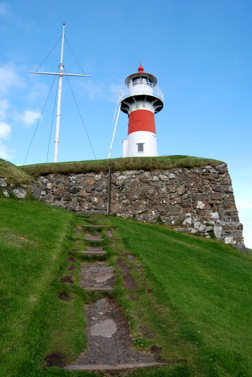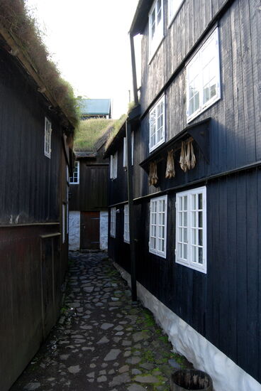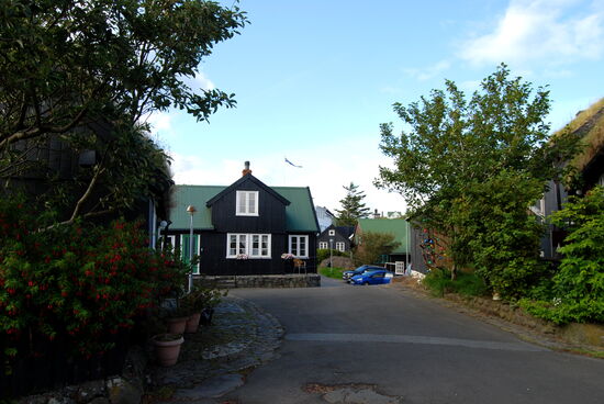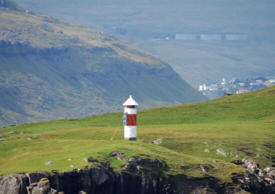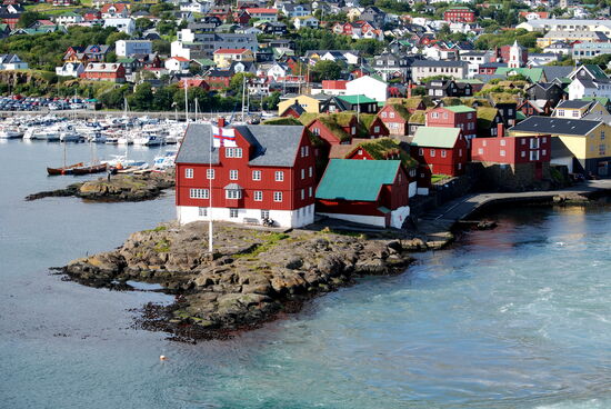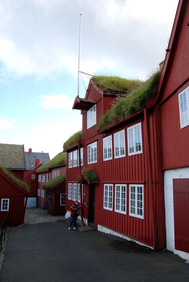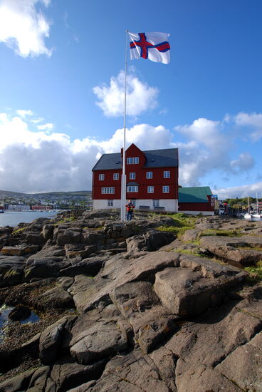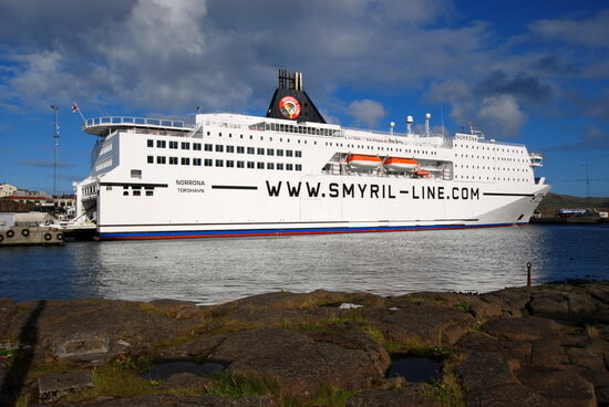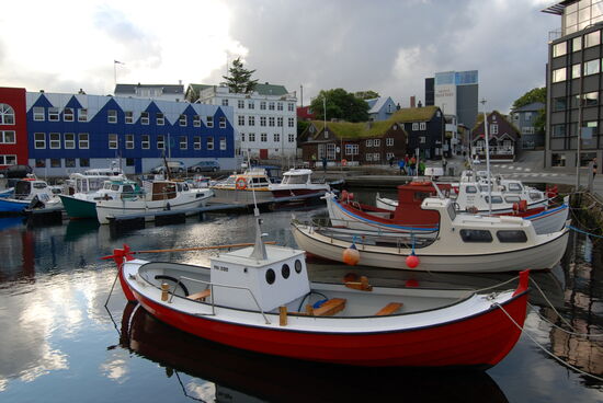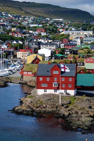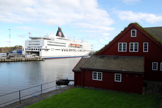 Da wir einen längeren Aufenthalt in Tórshavn haben sollten, wollten wir uns die Stadt ansehen. So gingen wir an Land und kletterten erst einmal zu der alten Festungsanlage Skansar í Havn mit dem hübschen rot-weißen Leuchtturm hinauf. Von dort hatten wir einen tollen Blick auf das Meer, die Fähre und die Stadt. Dort gingen wir nun hinunter. Es gab viele Holzhäuser mit Grasdächern. Durch viele kleine Gassen gingen wir auf die Halbinsel Tinganes hinaus. Das war der alte Tingplatz der Vikingar. Nun ist es das Regierungsviertel der Färöarna. Wir gingen bis nach vorne zur Flagge, von wo wir einen schönen Blick auf die Häuser und die Fähre hatten. Um die Bucht mit dem Kleinboothafen gingen wir zurück zur Fähre. Wir hatten noch ein bißchen Zeit, uns auszuruhen, bevor es Zeit wurde, zum Buffé zu gehen. Wir hatten einen Platz über der Rampe. So konnten wir die ganze Zeit der Beladung der Fähre zusehen. Mit einigen Stunden Verspätung verließen wir im Dunkeln Tórshavn.